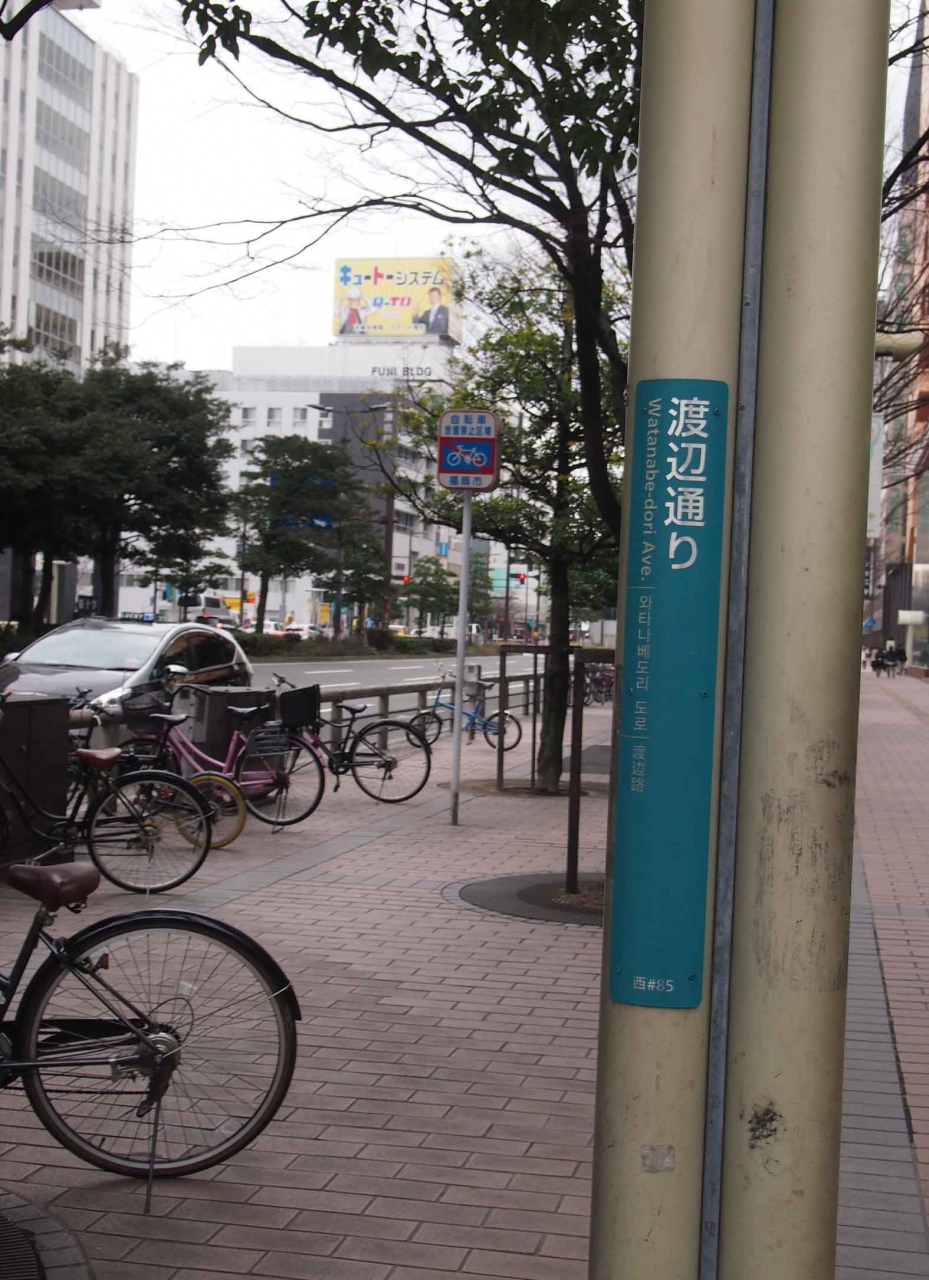 渡辺通りは西鉄の開通に尽力した呉服商渡辺與八郎の名を冠した通りです。この通り沿いには三越・大丸の他、天神の商業施設が建ち並びます。地下には有名な天神地下街が通っています。天神駅にはバスターミナルもあるのでバスの通行量が非常に多いです。