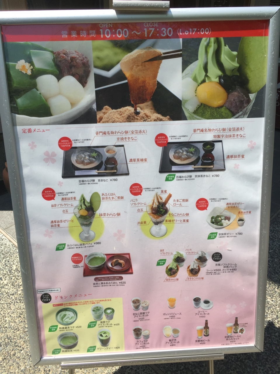 写真スポットもあり、比較的静かで、とてもきれいです。百福わらびもち780円、抹茶ゼリーも同じ金額。パフェには黒糖ゼリーや黒蜜、きなこわらびもちがはいって、栗まではいって贅沢です。飲み物はきなこ黒糖らてがおすすめ。