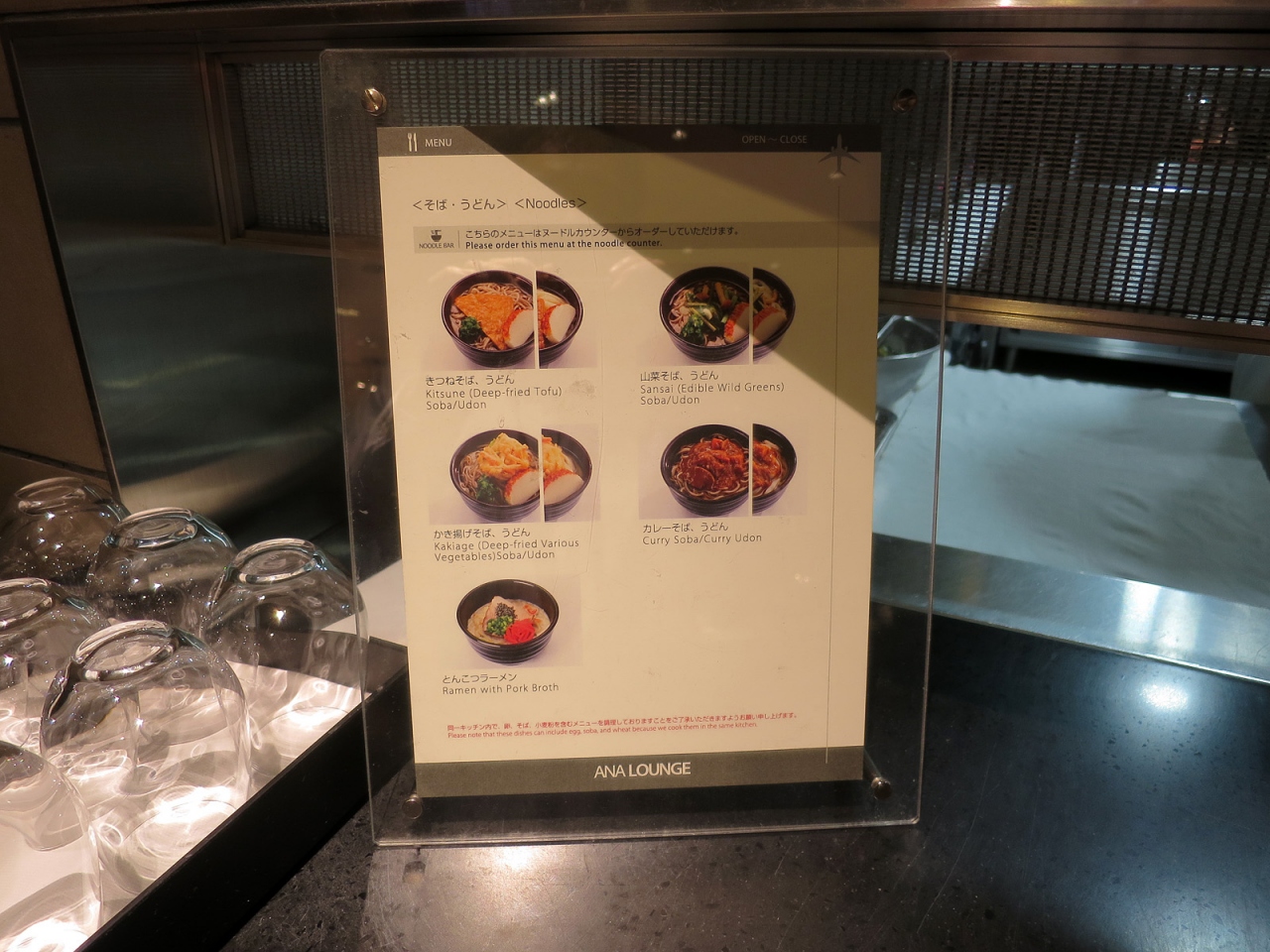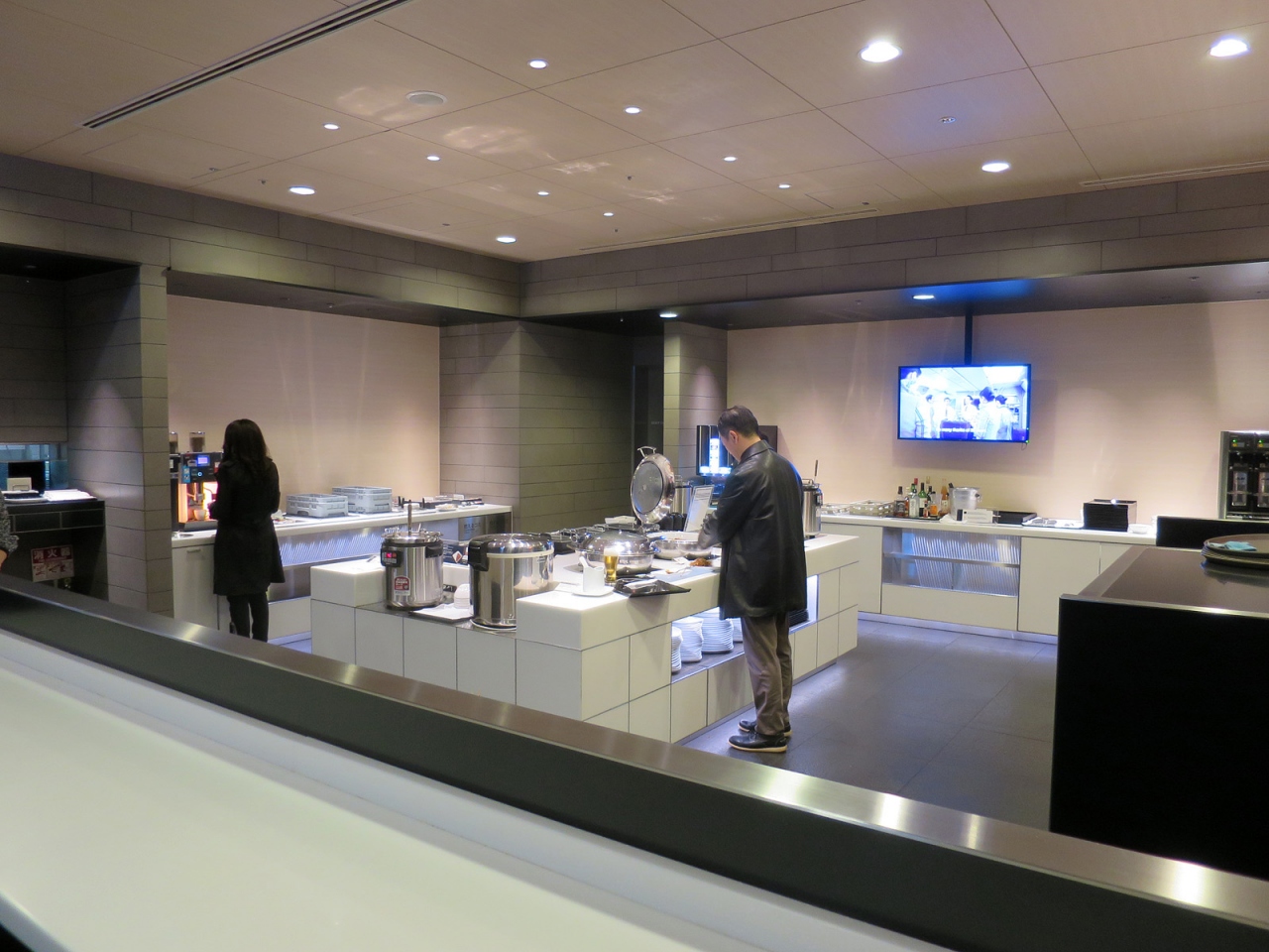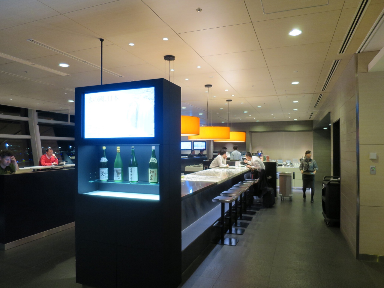 羽田の国際化に伴って設置されたANAラウンジです。それまでANA国際線用ラウンジは成田空港にしかありませんでしたから、利用客数や客質が明らかに違うであろう羽田空港にラウンジを開設・運用することは試行錯誤の連続であったと思われます。私が覚えているだけでも、開設以来3度のマイナーチェンジを経ていることからも、その苦労がしのばれます。さて私が利用できるのは上級キャビン搭乗者・スターアライアンスゴールド会員以上が利用対象者であるANAラウンジです。まだANAスイートラウンジの利用経験はありません。さてANAラウンジはなかなかの広さがあります。右手から中央辺りまではダイニングエリアで、左手奥がソファー席になっています。ビュッフェ台近くの大きなダイニングテーブルやカウンター席などには石が用いられ、黒を基調にした東京らしいクールな色使いで一見すると格好良いのですが、ダイニングエリアに並ぶ椅子・テーブルの質感は高くなく、テーブル間隔も狭めです。かと言って、奥にあるソファー席に向かうほどゆっくりとした時間はありませんし、1人での利用ということもあって、いつものようにカウンター席に着きました。こうした航空会社のラウンジで、バーカウンター以外のカウンター席が多く設けられているのは、このANAラウンジの特徴の1つだと思います。料飲関係について言えば、かつては右手に1か所のみであったビュッフェ台が、現在はソファー席の並ぶ左手奥にも新設されていました。料理そのものは同じもので、違いと言えばヌードルバーの有無くらいです。ただ利用者の多くは右手のビュッフェ台に集中して料理の補充も大変そうですが、左手のビュッフェ台周辺は静かなものです。よく観察していると、ラウンジ右手のダイニングエリアには日本人を中心としたアジア人客が、左手のソファー席には欧米人の利用が多く、いつの間にか棲み分けが成されているような雰囲気がありました。比較的長距離線の利用者が多く、ラウンジで内で身体を休めようとしている欧米人に比べ、中短距離線の利用者が多いであろう日本人・アジア人客は入口手前側に位置するダイニングエリアに席をとり、また提供されている食事メニューが口に合う日本人がビュッフェ台の主要客層になっているような気がします。その食事メニューですが、洋風・中華風などのホットミール3種類にサラダやサンドイッチ。和食系では稲荷寿司・巻き寿司、おにぎり、カレー、味噌汁、そして蕎麦・うどんのヌードルステーションと、凝ったものはありませんが炭水化物系は充実しています。甘いデザート系は多くはありません、定番のリンツのチョコレートと杏仁豆腐、そして嬉しい季節のお菓子。今回は桜サブレで、こういうものが増えてくれれば良いのですが…。あっ、最後に大切なお酒類です。関西空港などANAラウンジでは日本各地の地酒が月替わりで提供されていて楽しみにしています。この羽田空港でもそうしたサービスはあるのですが、利用者が多く、時間帯などによって在庫がなくなってしまうそうで、今回も楽しめませんでした、大変に残念なことです。