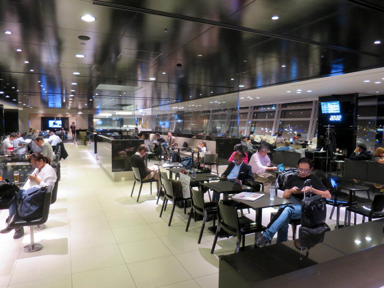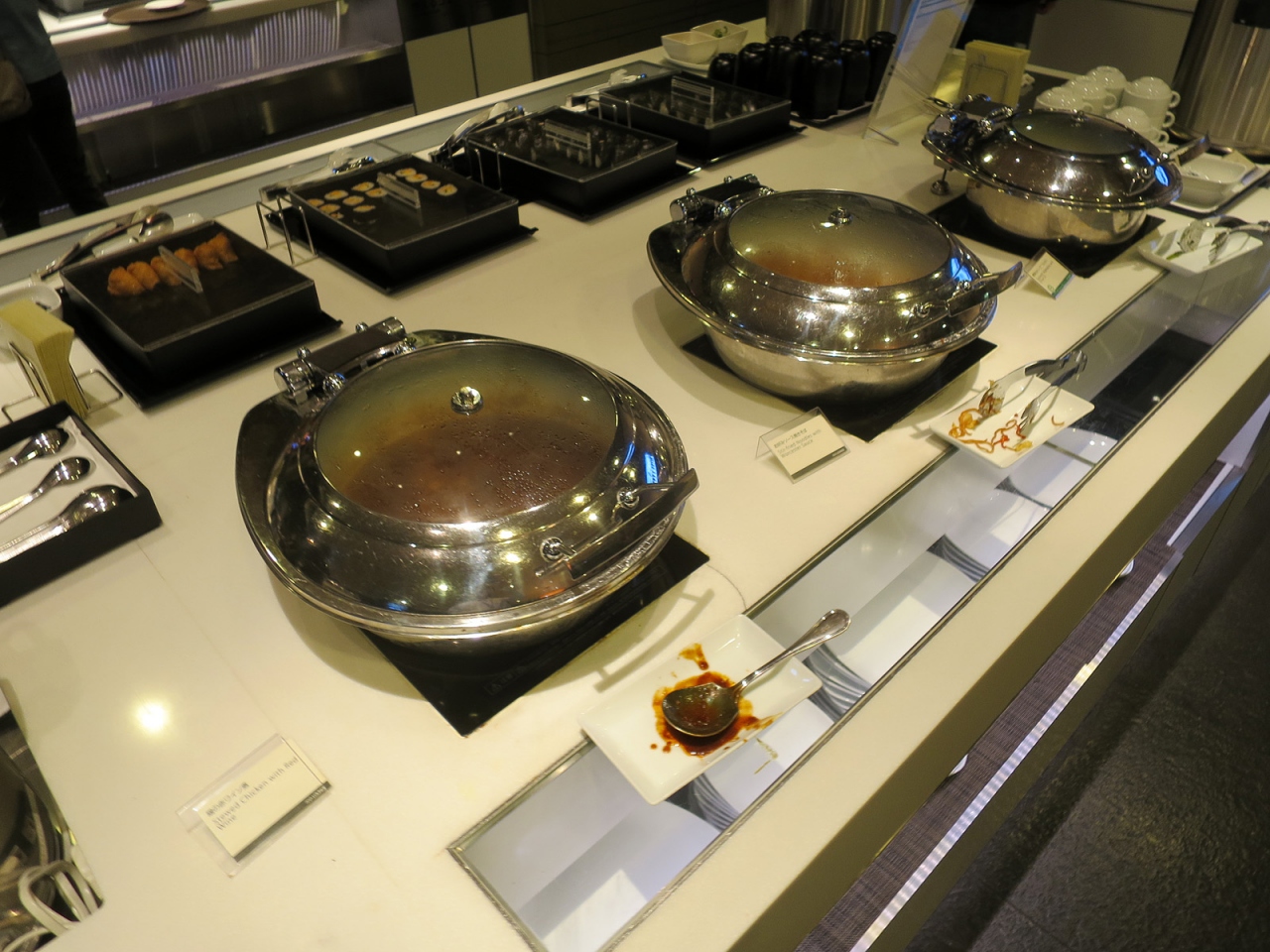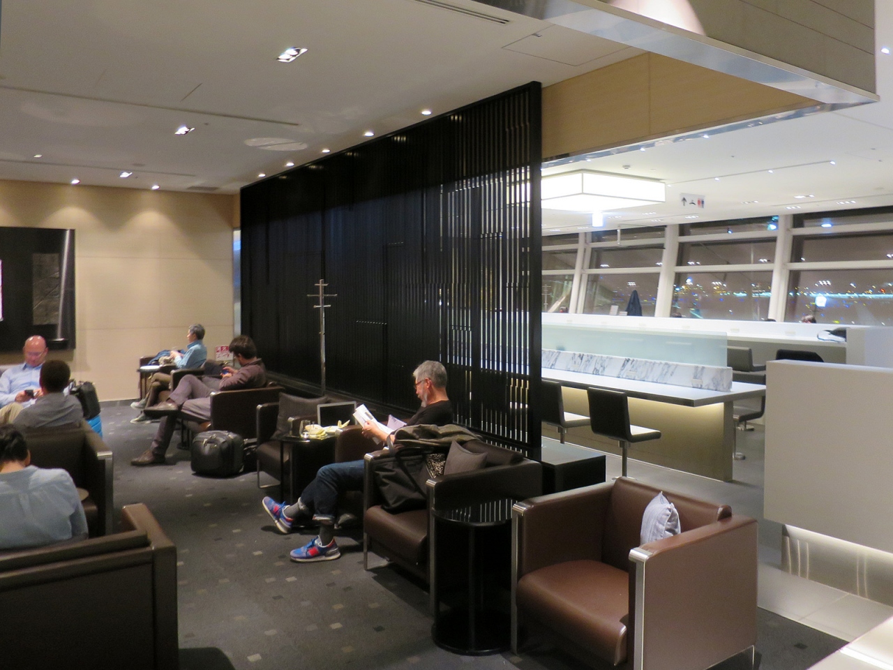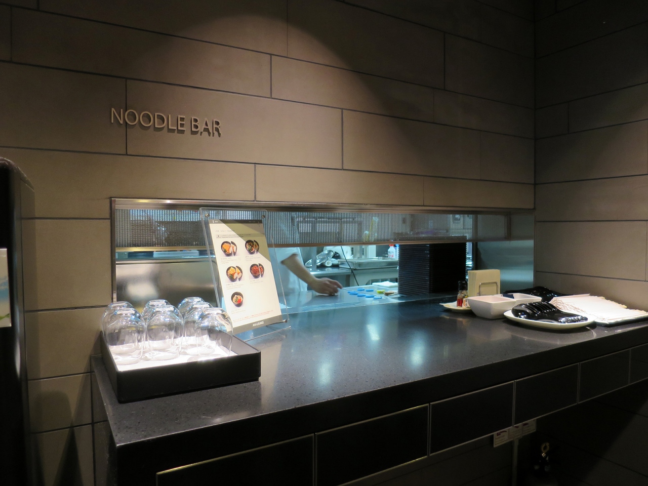 羽田の国際化に伴って設置されたANAラウンジです。それまでANA国際線用ラウンジは成田空港にしかありませんでしたから、利用客数や客質が明らかに違うであろう羽田空港にラウンジを開設・運用することは試行錯誤の連続であったと思われます。私が覚えているだけでも、開設以来3度のマイナーチェンジを経ていることからも、その苦労がしのばれます。さて私が利用できるのは上級キャビン搭乗者・スターアライアンスゴールド会員以上が利用対象者であるANAラウンジです。まだANAスイートラウンジの利用経験はありません。さてANAラウンジはなかなかの広さがあります。右手から中央辺りまではダイニングエリアで、左手奥がソファー席になっています。ビュッフェ台近くの大きなダイニングテーブルやカウンター席などには石が用いられ、黒を基調にした東京らしいクールな色使いで一見すると格好良いのですが、ダイニングエリアに並ぶ椅子・テーブルの質感は高くなく、テーブル間隔も狭めです。かと言って、奥にあるソファー席に向かうほどゆっくりとした時間はありませんし、1人での利用ということもあって、いつものようにカウンター席に着きました。こうした航空会社のラウンジで、バーカウンター以外のカウンター席が多く設けられているのは、このANAラウンジの特徴の1つだと思います。料飲関係について言えば、かつては右手に1か所のみであったビュッフェ台が、現在はソファー席の並ぶ左手奥にも新設されていました。料理そのものは同じもので、違いと言えばヌードルバーの有無くらいです。ただ利用者の多くは右手のビュッフェ台に集中して料理の補充も大変そうですが、左手のビュッフェ台周辺は静かなものです。よく観察していると、ラウンジ右手のダイニングエリアには日本人を中心としたアジア人客が、左手のソファー席には欧米人の利用が多く、いつの間にか棲み分けが成されているような雰囲気がありました。比較的長距離線の利用者が多く、ラウンジで内で身体を休めようとしている欧米人に比べ、中短距離線の利用者が多いであろう日本人・アジア人客は入口手前側に位置するダイニングエリアに席をとり、また提供されている食事メニューが口に合う日本人がビュッフェ台の主要客層になっているような気がします。その食事メニューですが、洋風・中華風などのホットミール3種類にサラダやサンドイッチ。和食系では稲荷寿司・巻き寿司、おにぎり、カレー、味噌汁、そして蕎麦・うどんのヌードルステーションと、凝ったものはありませんが炭水化物系は充実しています。甘いデザート系は多くはありません、定番のリンツのチョコレートと杏仁豆腐、そして嬉しい季節のお菓子。今回は桜サブレで、こういうものが増えてくれれば良いのですが…。あっ、最後に大切なお酒類です。関西空港などANAラウンジでは日本各地の地酒が月替わりで提供されていて楽しみにしています。この羽田空港でもそうしたサービスはあるのですが、利用者が多く、時間帯などによって在庫がなくなってしまうそうで、今回も楽しめませんでした、大変に残念なことです。
