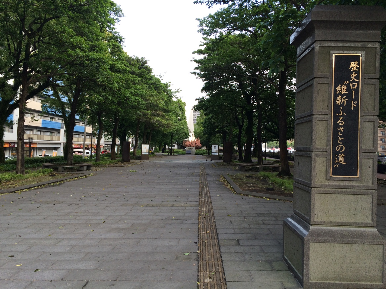 甲突川沿いに沿った整備された道で川沿いを歩くと対岸のビル群が見え緑多い遊歩道になっています。トイレや帽子の像、維新ふるさと館があり観光客の他に地元の人も多く散歩していました。道は結構長く街中の賑やかを忘れられる道でした。