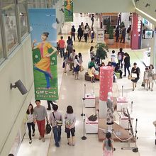 まず目を引くのは観覧車。夜になるとイルミネーションが灯されます。館内はブランドものの店舗が多いですね。フードコートも充実しています。