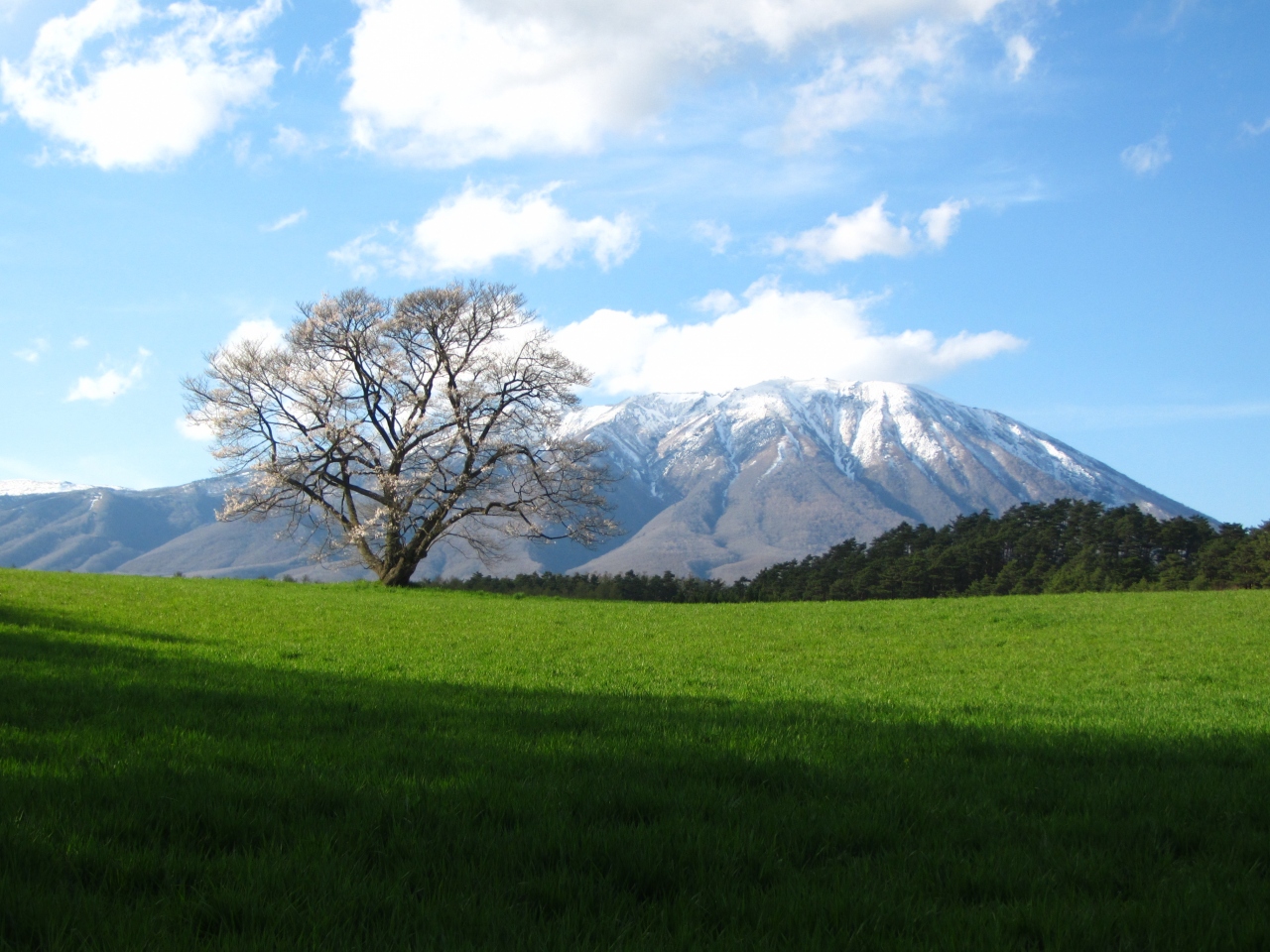 緑の芝生、雪をかぶった岩木山を背景に咲く桜は見応え十分です。