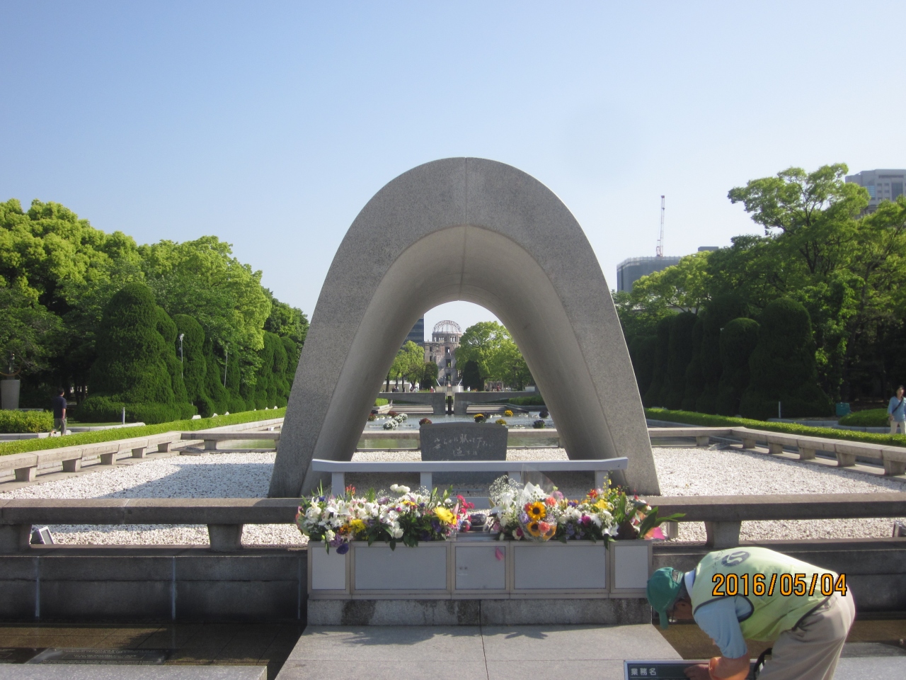 アーチ状の慰霊碑の間から遠くに原爆ドームを見ることができます。