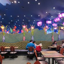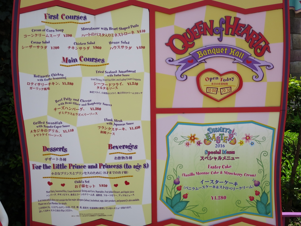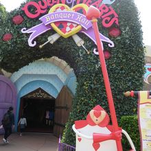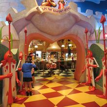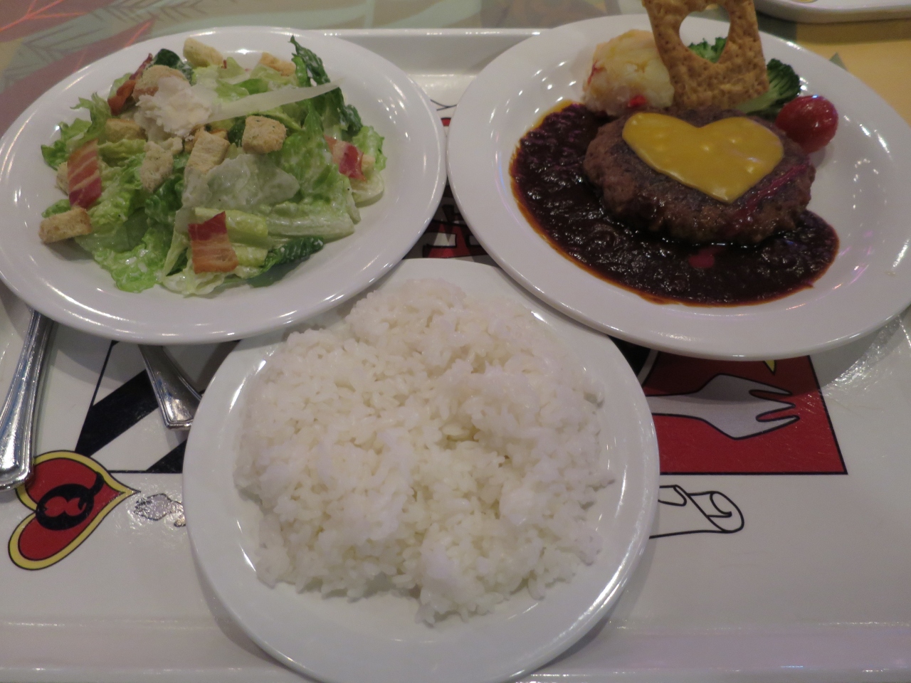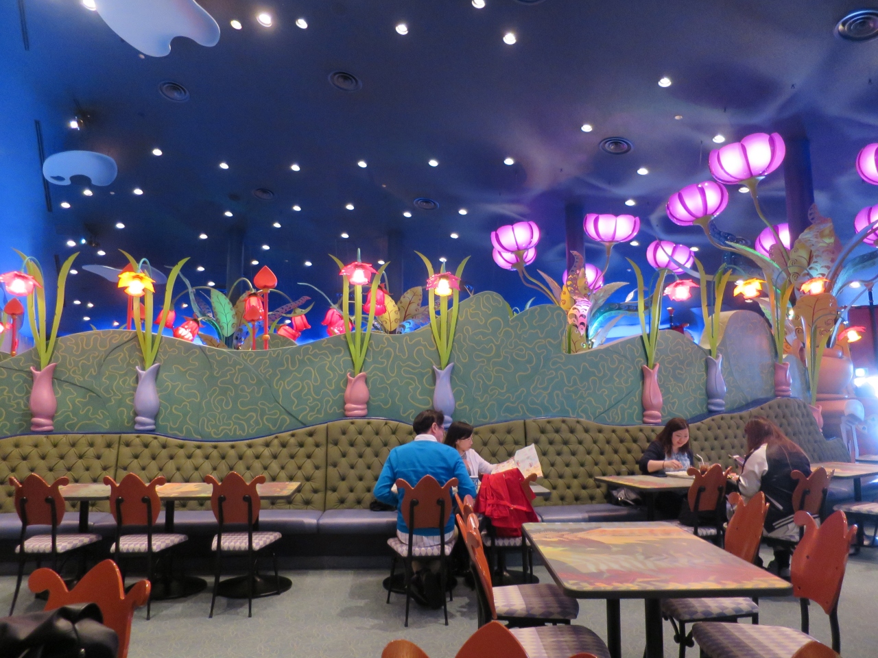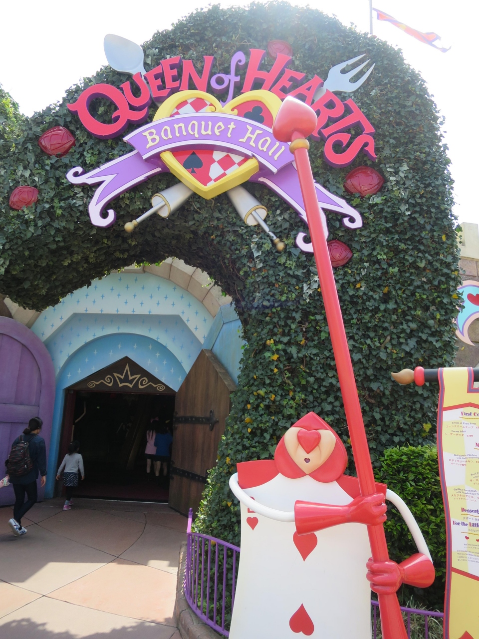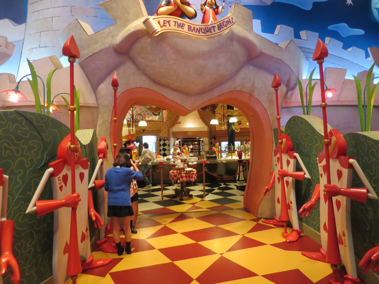ファンタジーランドのイッツァ・スモールワールドの左にある「不思議の国のアリス」をモチーフにしたレストラン。トランプの衛兵が入口を守っていました。11時に行くと並ばずに入れました。社員食堂の様に食べたいメニューを取って、レジに行くシステムになっています。ハンバーグを頂きましたが、見た目はいまいちですが、味はそこそこでした。雰囲気を楽しみながら戴くレストランです。