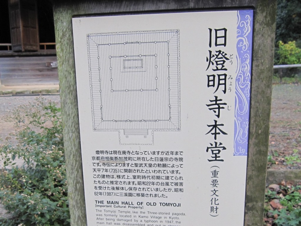 燈明寺は、現在廃寺になっていますが、近年まで京都府相楽郡賀茂町にあった日蓮宗のお寺です。昭和22年の台風で、被害を受けた後、解体されて保存されていたものが、昭和62(1987)年三溪園に移築されたようです。旧燈明寺三重塔から本堂を見下ろすことが出来ます。また本堂の中には、仏像も祀られています。