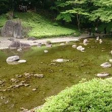 旧水戸徳川藩の江戸上屋敷であった場所にある、小石川後楽園の園内にある、名所・旧跡を再現したスポットです。園へ正門から入り、そこから左手の方向に進んでいくと、水が豊かなゾーンになります。その右手にあるのが、こちらの大堰川です。その風景は本当の河原のようになっており、その風景は河川の中流域のような感じです。川面のところどころに石が配されており、陸地の河原の部分も小さな石、中ぐらいの石と敷かれており本当の河原のようです。