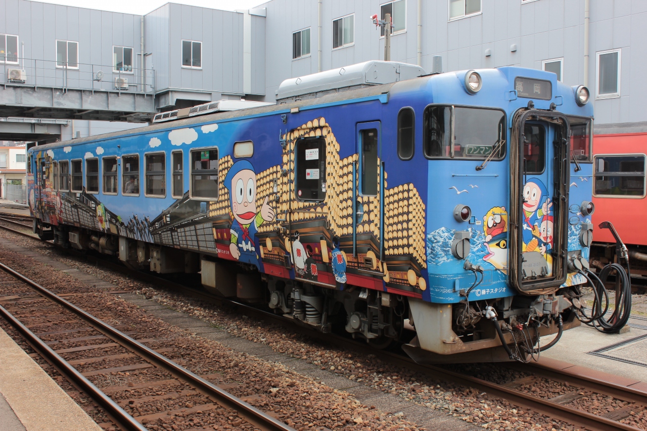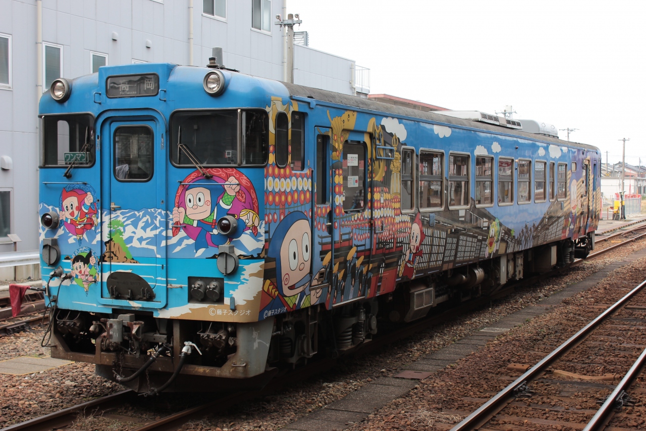 ハットリくんとその登場人物が描かれている、城端線と氷見線のラッピング列車です。様々なバージョンがあり、全部撮影するのは結構大変だと思います。ハットリくんのキャラクターと沿線の名物や風景もあるので、観光がてら乗ってみるのはいかがでしょう。