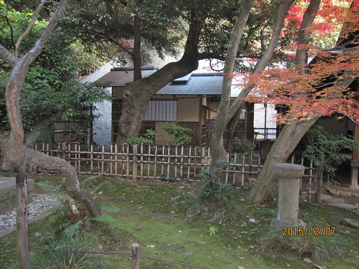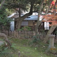 月華殿の横にひっそりと佇む小さな茶室です。この茶室は原三溪が大正7(1918)年に建てた一畳台目の茶室です。
