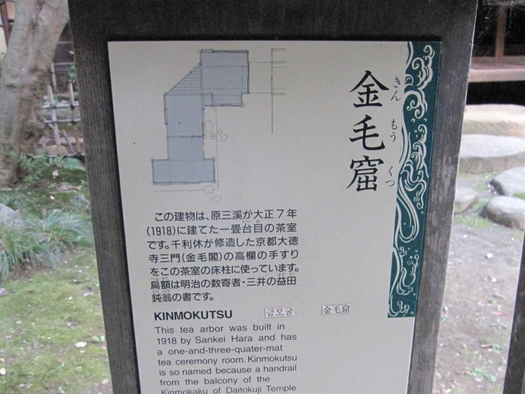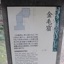 「金毛(きんもう)」の名前は、千利休が修造した京都大徳寺の山門(金毛閣)の高欄の手摺をこの茶室の床柱に使っていることに由来しています。
