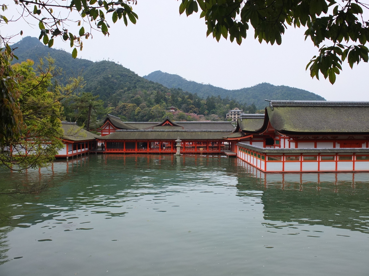 厳島神社の入口に満潮時間と干潮時間が書いてあり、これを頼りに両方の景色を楽しみました。満潮の時は、水が神殿の床ぎりぎりまでくるので、水の上に浮いているような神秘的な光景でした。逆に干潮の時は、水の底の土が見えてきて、全く違う景色でした。