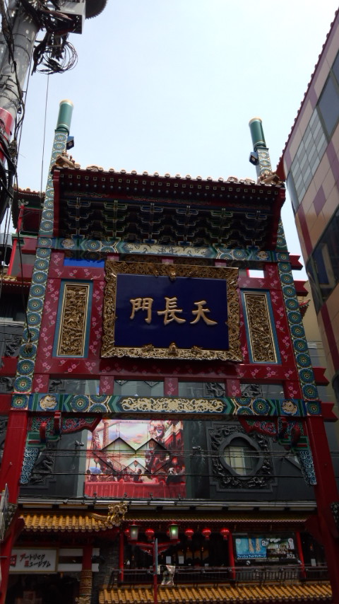 元町・中華街駅の近く、石川町方面に向かう関帝廟通りの東側入口付近にある牌楼です。大型アミューズメント施設「横浜大世界」の目の前にあり、多くの観光客で賑わっていました。山下町公園もこのすぐ近くにあります。