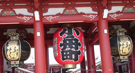 雷門をくぐり、仲見世通り商店街を進むと宝蔵門があります。「小舟町」と書かれた大提灯が目立ちます。左に呵形像、右に吽形像の仁王像が構えています。宝蔵門裏には、大きなわらじがかかっています。「大きなわらじに驚いて魔が去っていく」と言われているそうで、魔除けと健脚を祈願しました。