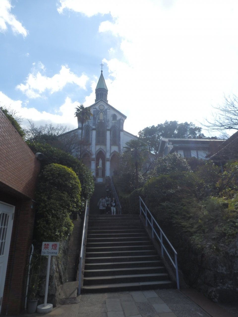 路面電車で大浦天主堂下でおり、坂を上っていきます。両側にはたくさんのカステラを売っているお店があるので、試食をしながら上っていくと正面に天主堂がそびえています。ここは現存する木造ゴシック様式の中では最古の国宝となっています。