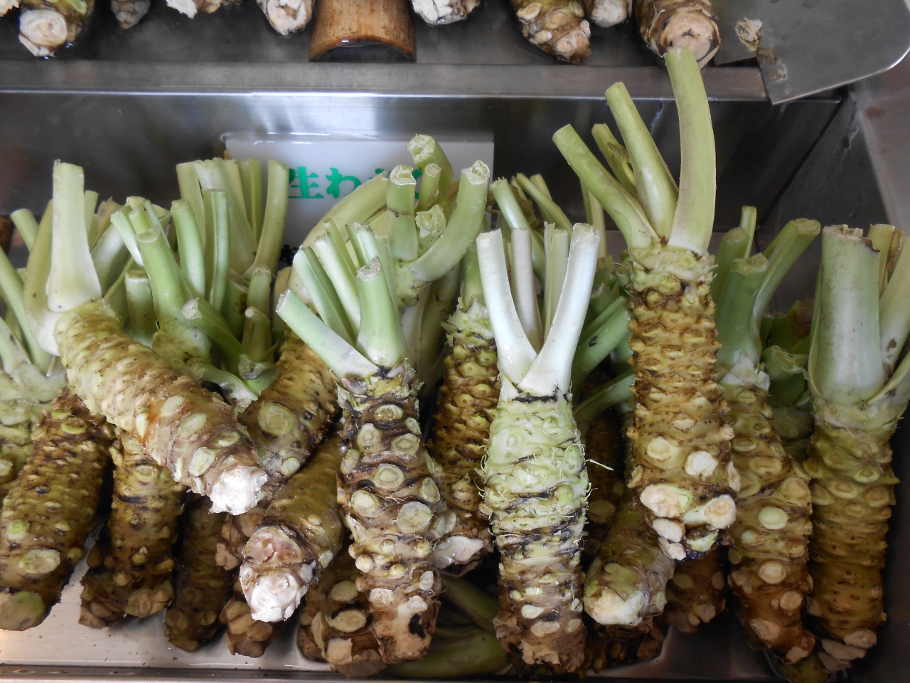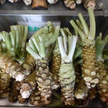 大王わさび農場の入口を入ってすぐのところにあるおみやげ屋です。店頭では生わさびを売っていましたが、1本2,000円~3,000円する見たこともない大きなわさびも売られていました。また、店内にはわさび漬けや漬物などのおみやげも売っていました。