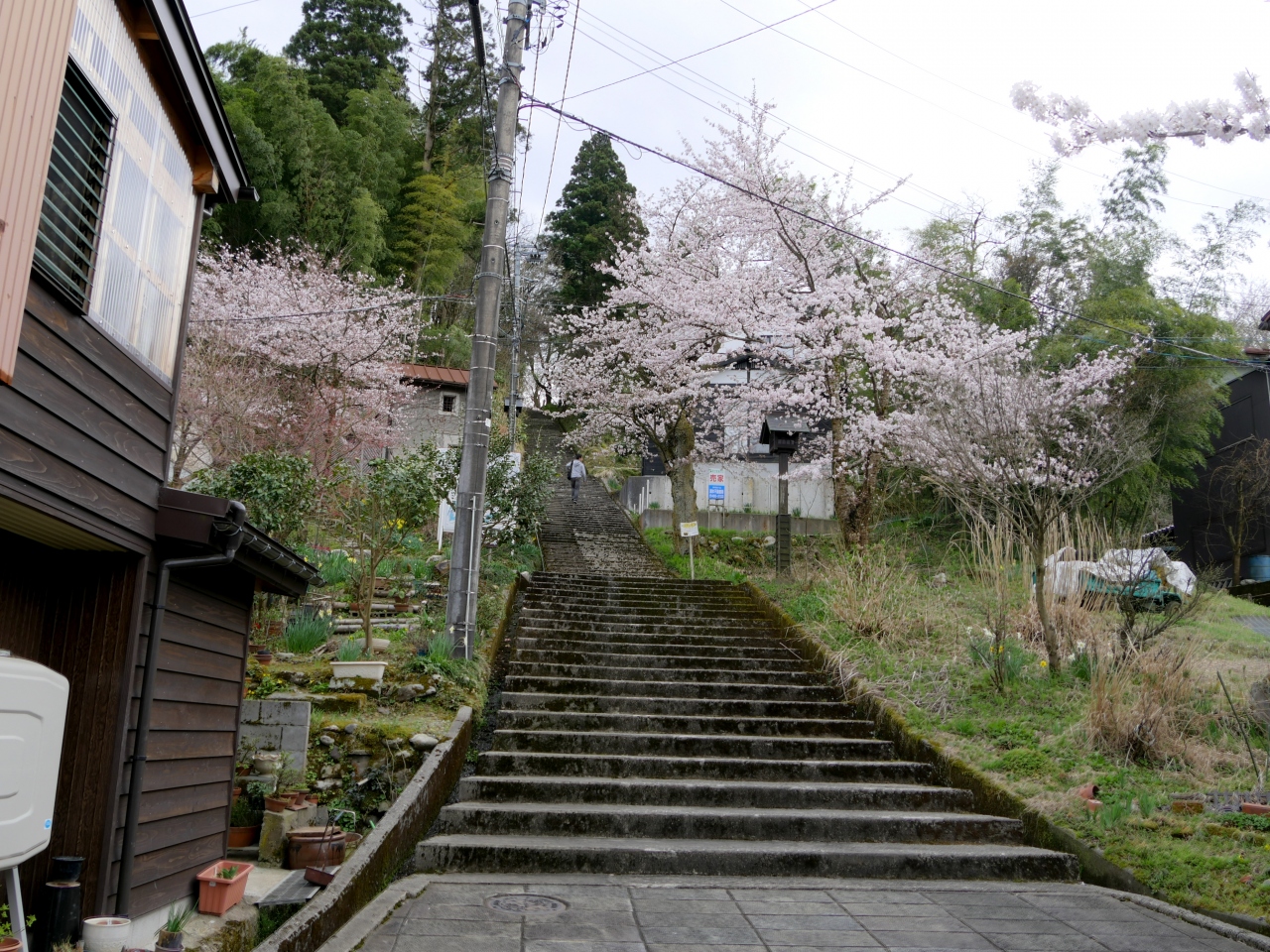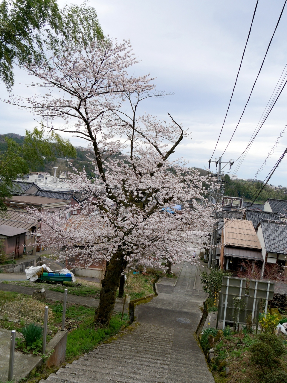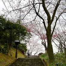 諏訪町通りから200段くらいの階段を上る.頂上に小さな公園があり,途中の階段にも,公園にも桜の木がたくさんある.桜の季節はとてもきれいだ.周りは木々に囲まれ眺望は期待できない.唯一八尾学校側が開けている