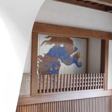 江島神社の大きな鳥居をくぐり、階段を上った先に、龍宮城を模した楼門「瑞心門」があります。天井には牡丹の絵画が、壁には唐獅子の絵画が描かれていました。また、今年の干支「申年」にちなんだ絵馬も飾ってあり、「厄を除りさる」とかわいらしいサルが描かれていました。