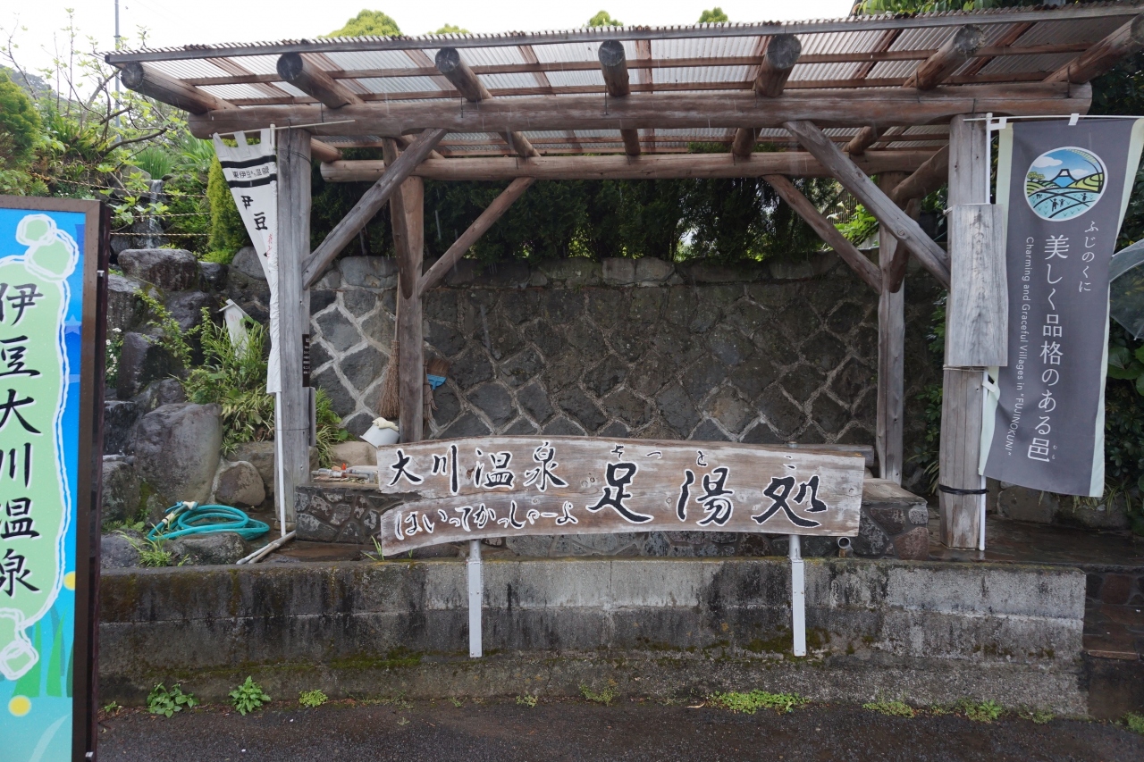 大川温泉駅前にある屋根つきの無料の足湯です。柱には「美味の宿伊豆おおかわさんのご厚意により余剰の温泉を利用しています。利用状況によりお湯が止まることもありますんので、ご了承ください」と書かれています。