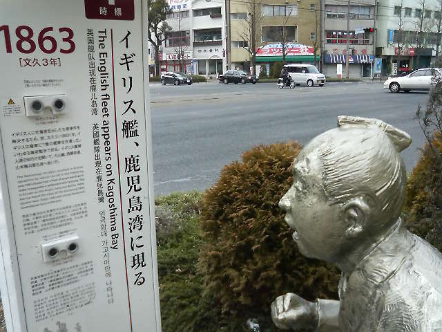 鹿児島市電・鹿児島中央駅から歩いて10分ほど、市電通り沿いに建っている銅像です。