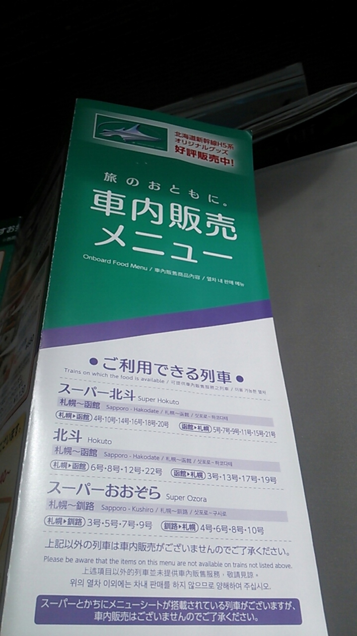 この「スーパーおおぞら」、1・2・11・12号(札幌・釧路それぞれの始発と最終列車)を除き車内販売が実施され、女性客室乗務員の方がワゴンサービス形式にて弁当・飲み物・お菓子・お土産品等を販売しに車内を巡回します。