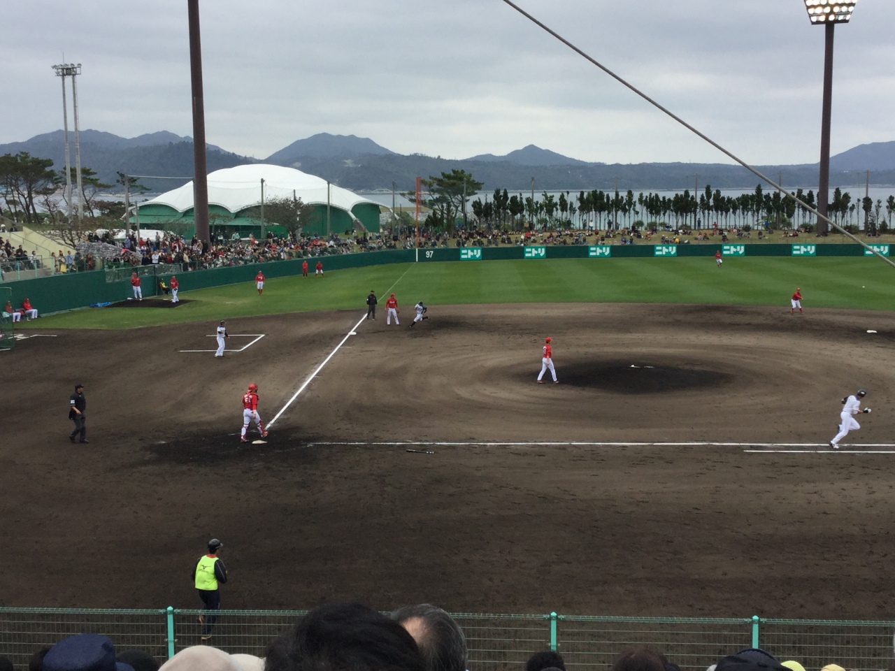 2月の沖縄キャンプ時、カープと日ハムの練習試合を見に行きました。現地までは車で行けず、漁港にいったん車を停めて、そこから大型のシャトルバスで移動することになります。防寒着やその他の応援グッズは気軽に車にとりにいけないので、車からバスに移動する前にある程度荷物をまとめておくことをお勧めします。(バスが待っていると焦るので)