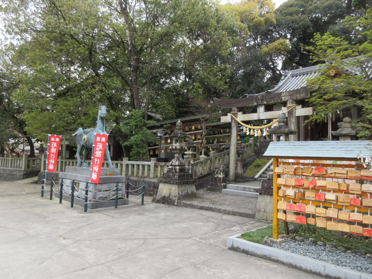 泉北高速鉄道「和泉中央駅」より、南海バス「春木川」または「若樫」行きに乗車し春日神社前で下車して、徒歩5分ほどです。住宅街の中にあります。入口には狛犬が、境内に入ると神馬が目を引きます。私が行った時のは日曜のお昼過ぎでしたが、他には誰もいませんでした。