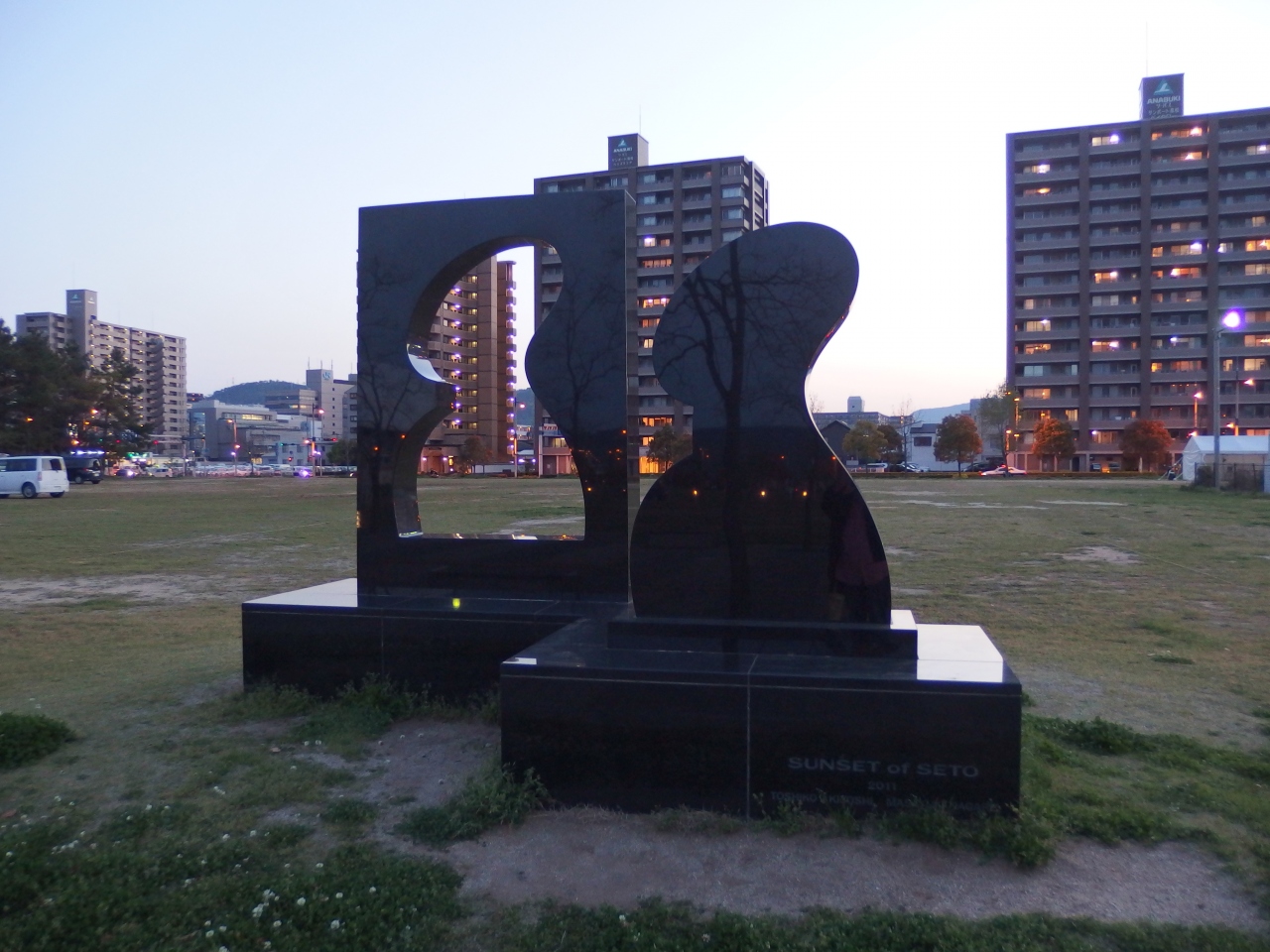 世界的に活躍している彫刻家、流政之さんの作品です。サンポート高松の大きな広場の中にあります。名前の通り東側からこの作品を見ると西側の夕日が沈むのが見えるように作られています。流さんは、彫刻の材料になる石の名産地で2006年に高松市に入った庵治町で永年制作されているので、ここ以外にも、高松市美術館や高松駅など結構多くの作品が展示されていますので、見て回るのも楽しいです。