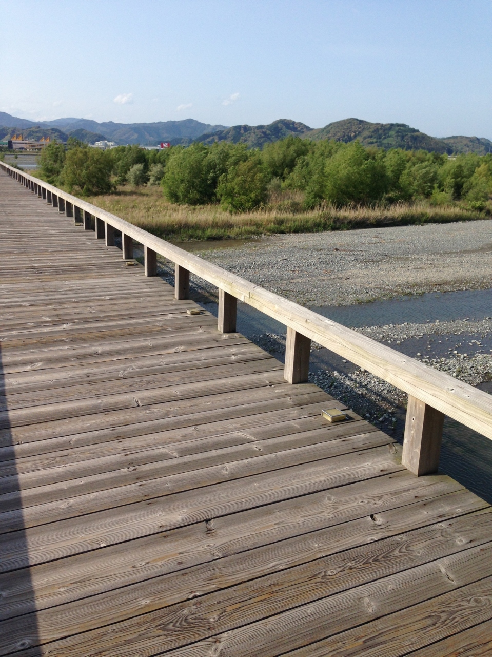 東海道嶋田宿にある、大井川にかかる木造歩道橋です。島田側から渡るには通行料(徒歩大人100円)が必要です。橋の長さは897メートルで、下を見ると結構な急流(日によりますが)で怖いです。私が行ったときは風が強かったので、ますます恐怖心をあおられました(笑)行くには車が必要ですが、島田側の入口には無料駐車スペースがあります。お弁当を持って河川敷で食べるのも良いと思います。
