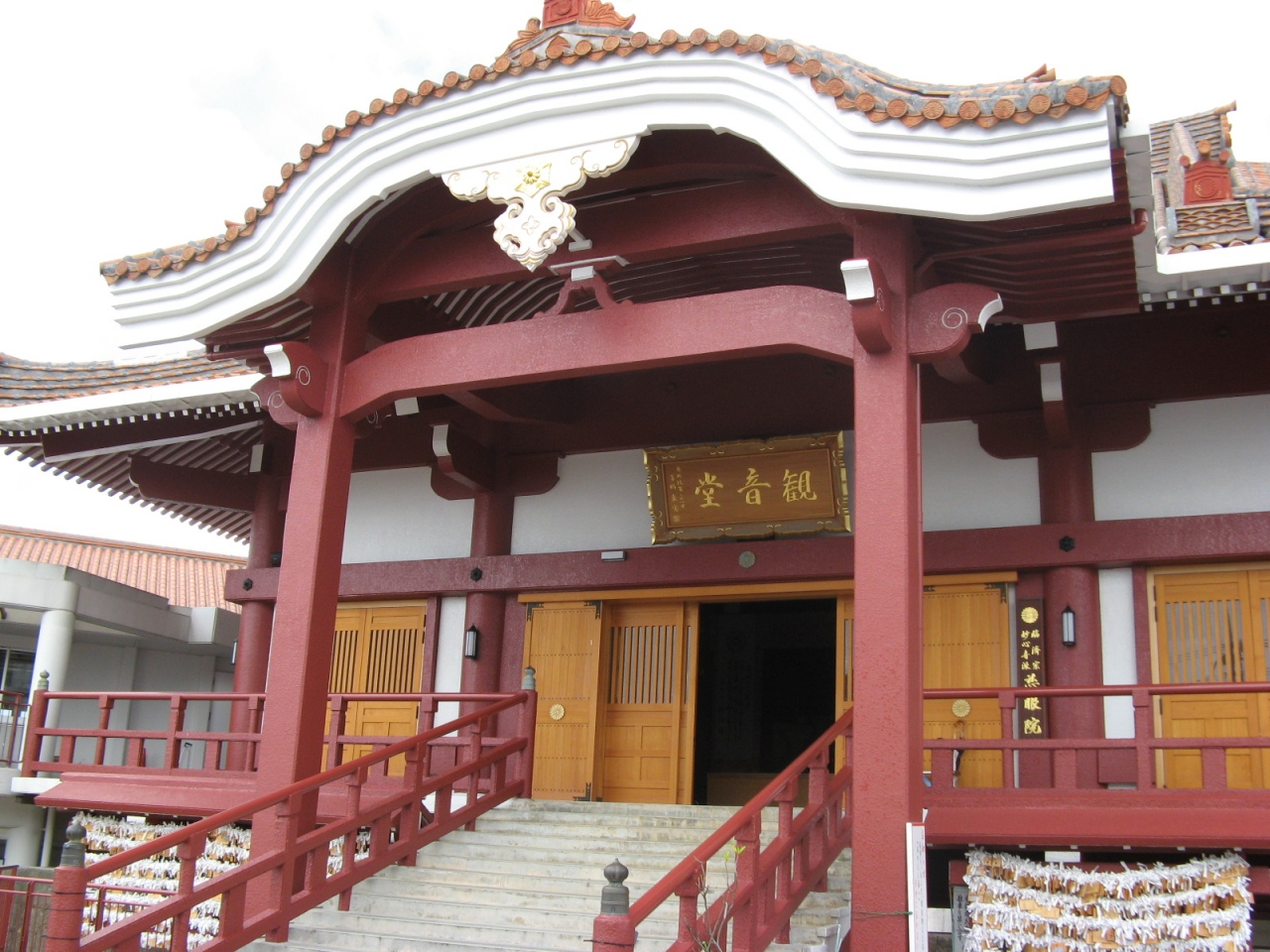 山門は沖縄らしい赤瓦、琉球石灰岩造りで鐘楼門となっていて、県内最大の梵鐘が設けられています。本堂は赤瓦に赤い柱がきれいで、広間は葬儀式や行事等がある時以外は、無料開放されているので、自由に参拝できます。