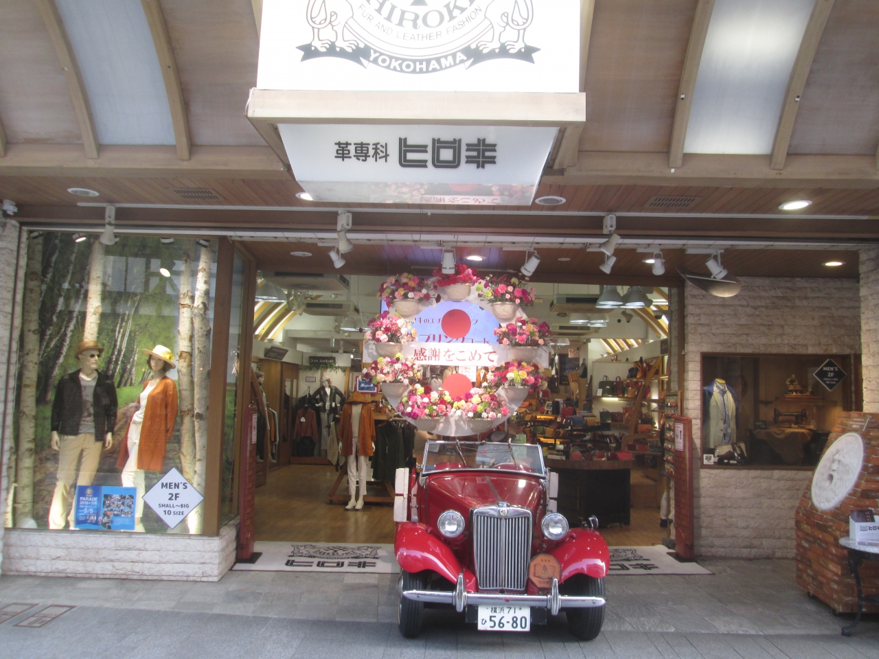 元街商店街メイン通りのほぼ中央に位置しています。店のエントランスの中央に赤いクラシックカーが置いてあるお店です。創業50年以上の歴史を誇る革の専門店で、ファッション、バッグ、シューズなどを扱っています。