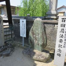 お寺の前に鐘があり、そのそばに大12第横綱久五郎の100回忌法要の碑と看板と