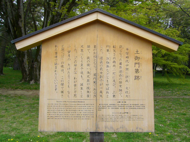 土御門第跡は京都御苑内の中央付近東側に位置しています。一番近い門は清和院御門ですが西側の蛤御門から入って清水谷家の椋を見学し御所の建礼門の前を通ってくるのも良いでしょう。ここには平安時代中期に藤原道長の邸宅があり、さらにのちには後一条天皇や後朱雀天皇がこの邸宅内でお生まれになられたようです。その後度重なる火災などにより今は邸宅はありませんがひっそりと立った駒札があります。美しい公園として整備されています。