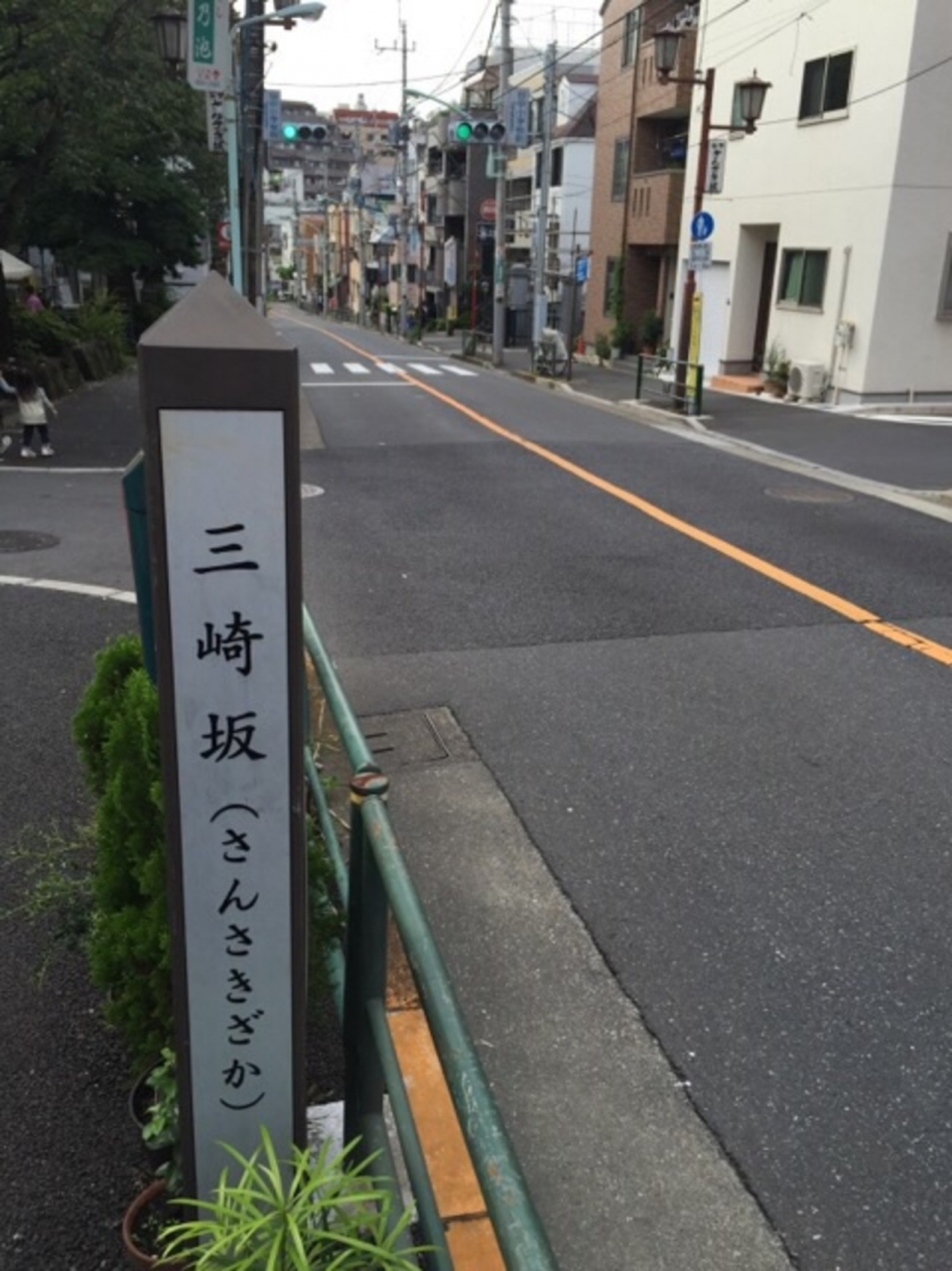 この坂がある三崎町は三遊亭円朝の怪談牡丹燈籠」さの舞台にもなったところで、右も左も寺ばかりで首を振り振り上り下りしたという説などから別名を首振り坂ともいわれています。