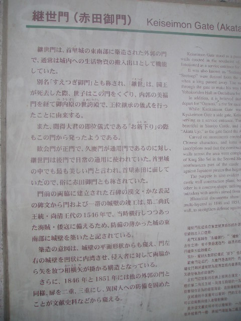 那覇市内一の観光地として知られる首里城ですが、実は観光客で賑わうエリアとは反対側、石畳道で名高い金城に近いエリアの首里城は、あまり観光テイストがなくて、気軽な散策スポットとしてお勧めできます。南側にある門としては、こちらの継世門がオススメで、元々は首里城の”裏門”的な位置付けで利用されていたそうです。赤田御門と呼ばれて親しまれていたそうですが、残念ながら戦争で焼失してしまい、現在あるのは復元の門となっています。ただ、傍に設置されている解説板には、戦前の貴重な写真も掲示されていますので、合わせてご覧になられると良いかと思います。