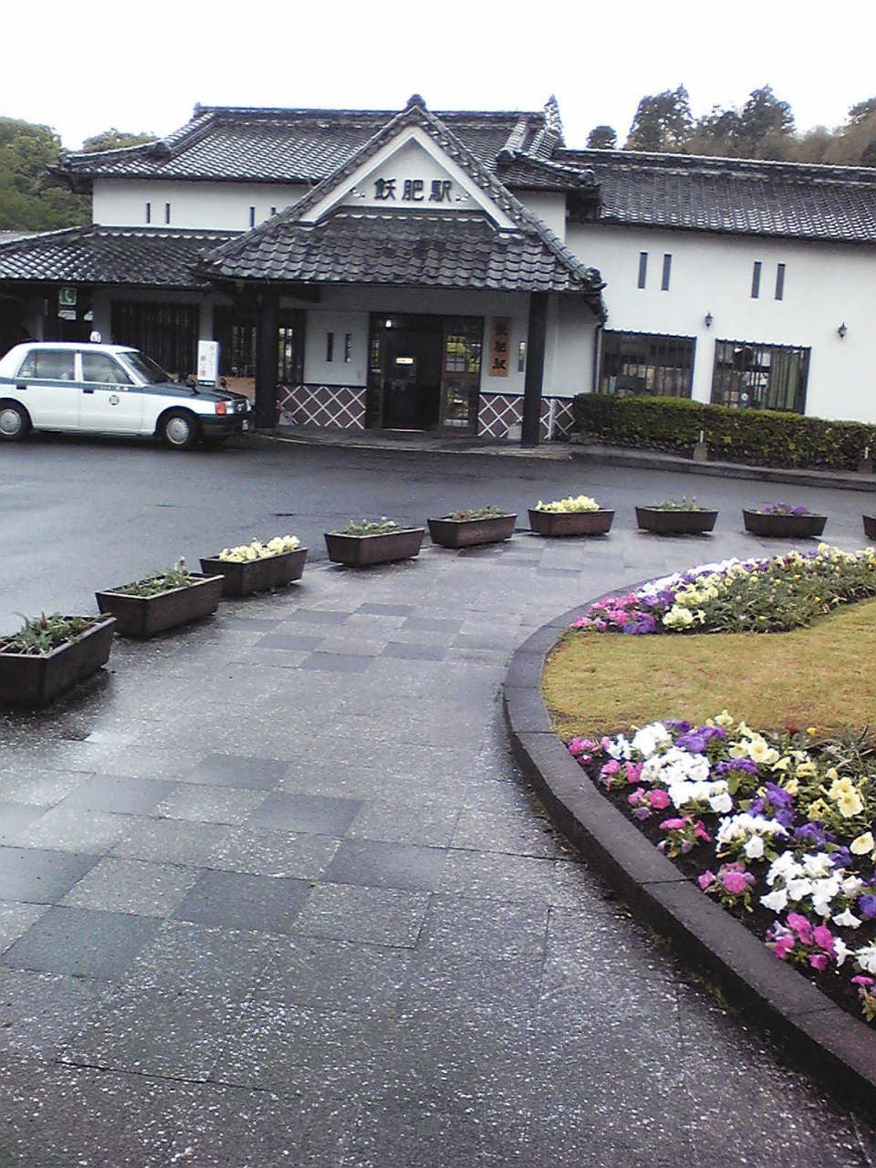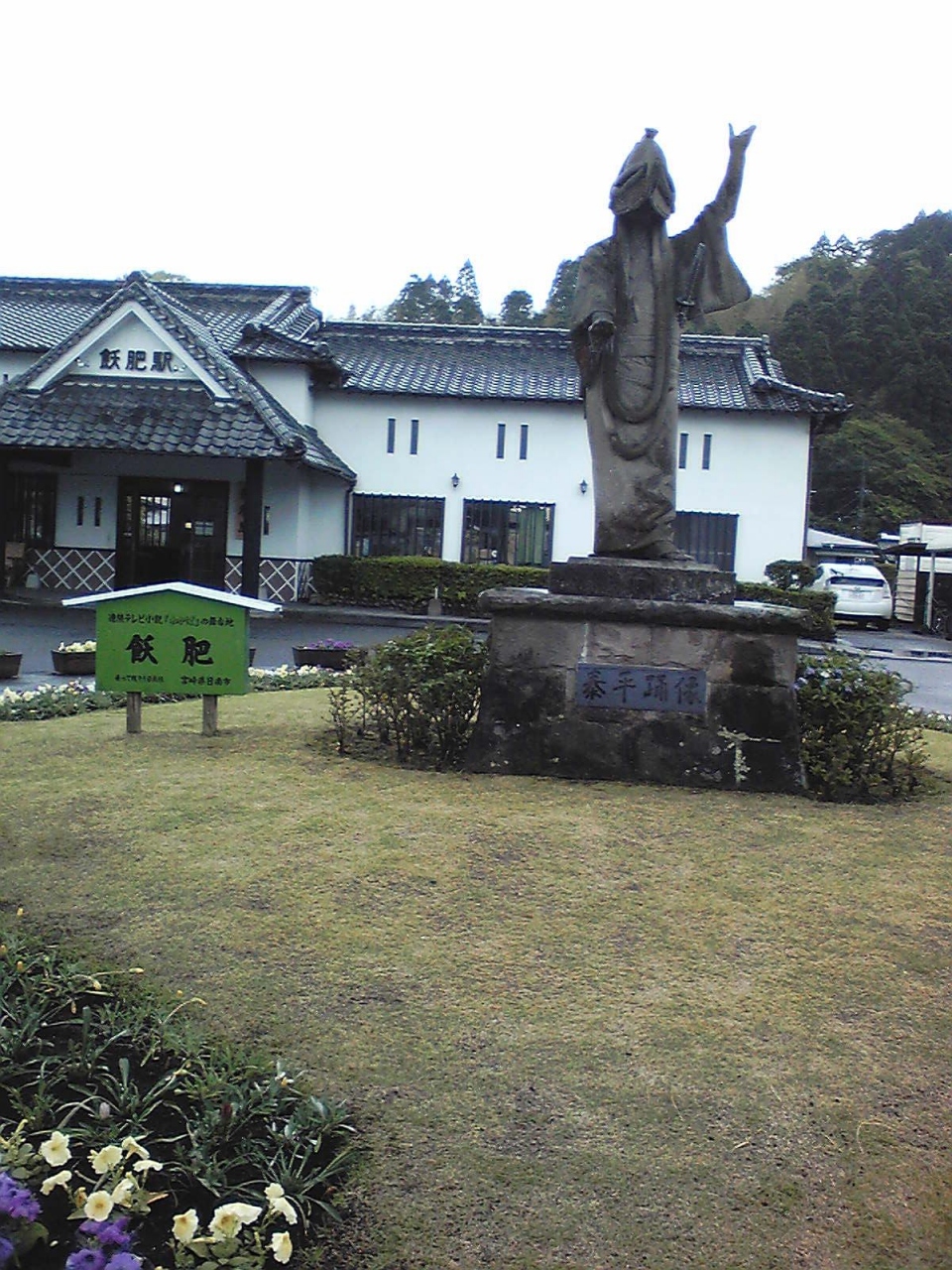 飫肥城を模して造られた木造の駅舎が特徴的です。日南の小京都、飫肥城下町の玄関口となる駅で、駅前には飫肥の泰平踊りの像があります。駅舎内の待合所には飫肥杉で作られたテーブルとイスが設置され、竹の虫籠が飾られ、観光客の目を楽しませています。JR九州の観光特急「海幸山幸号」はこの駅で比較的長く停車します。確か、20分ぐらい?特急が入線すると、ホームで地元の特産品の販売をしていました。飫肥の観光の中心地は川を渡って500m程離れた場所にあります。駅前は閑静な住宅地となっています。