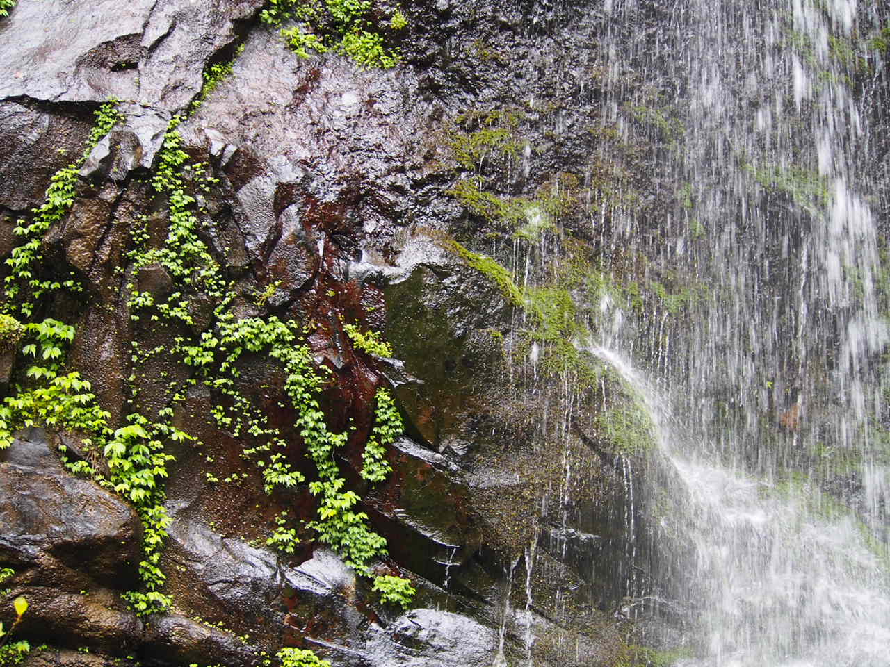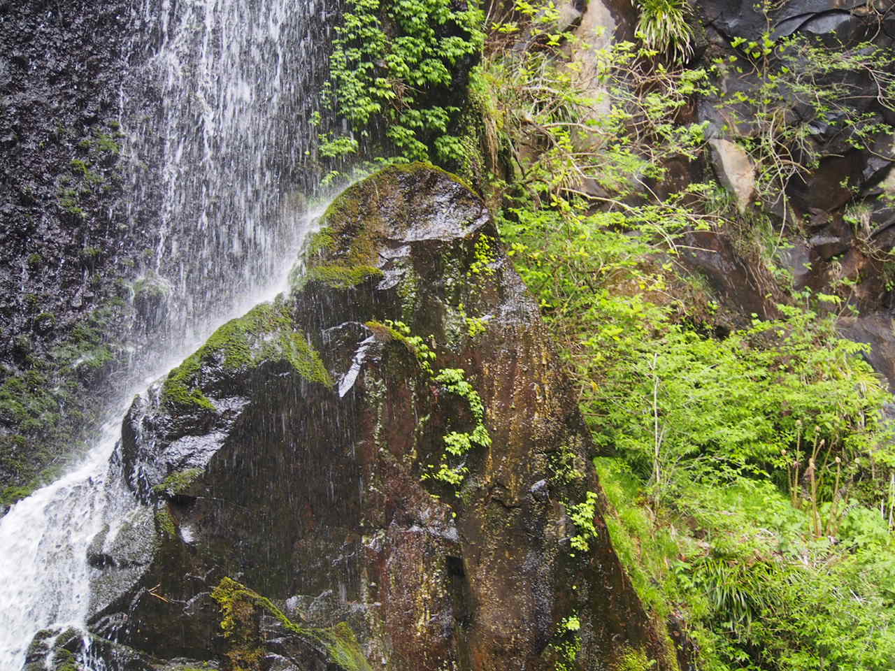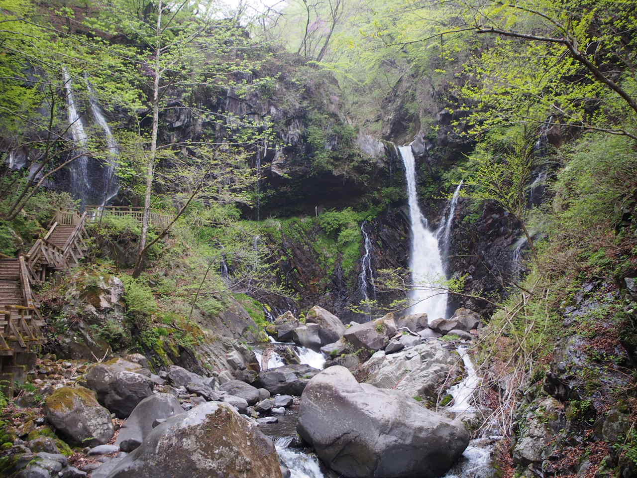 大小の滝がいくつかあり、一番大きな滝でも、落差がたいしてありませんが、静寂で美しい滝です。昔は、裏から見ることができたようですが、今は見ることはできません。駐車場もトイレも完備、少し歩きますが、比較的、楽に行くことができる滝です。5月は新緑が綺麗でした。