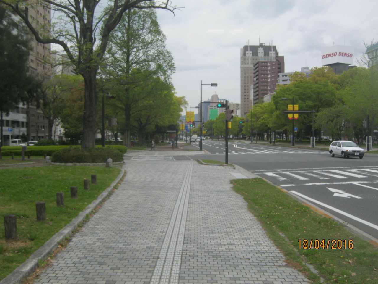 京橋川から元安川の間の大道理です。左右に遊歩道をかねた緑地の散策できるように整備されています。興味がわいたのは石灯籠が並んでいます。複製画ほとんどですが日本の特色ある形のものを置いていて改札板もあります。楽しんで散策できます。