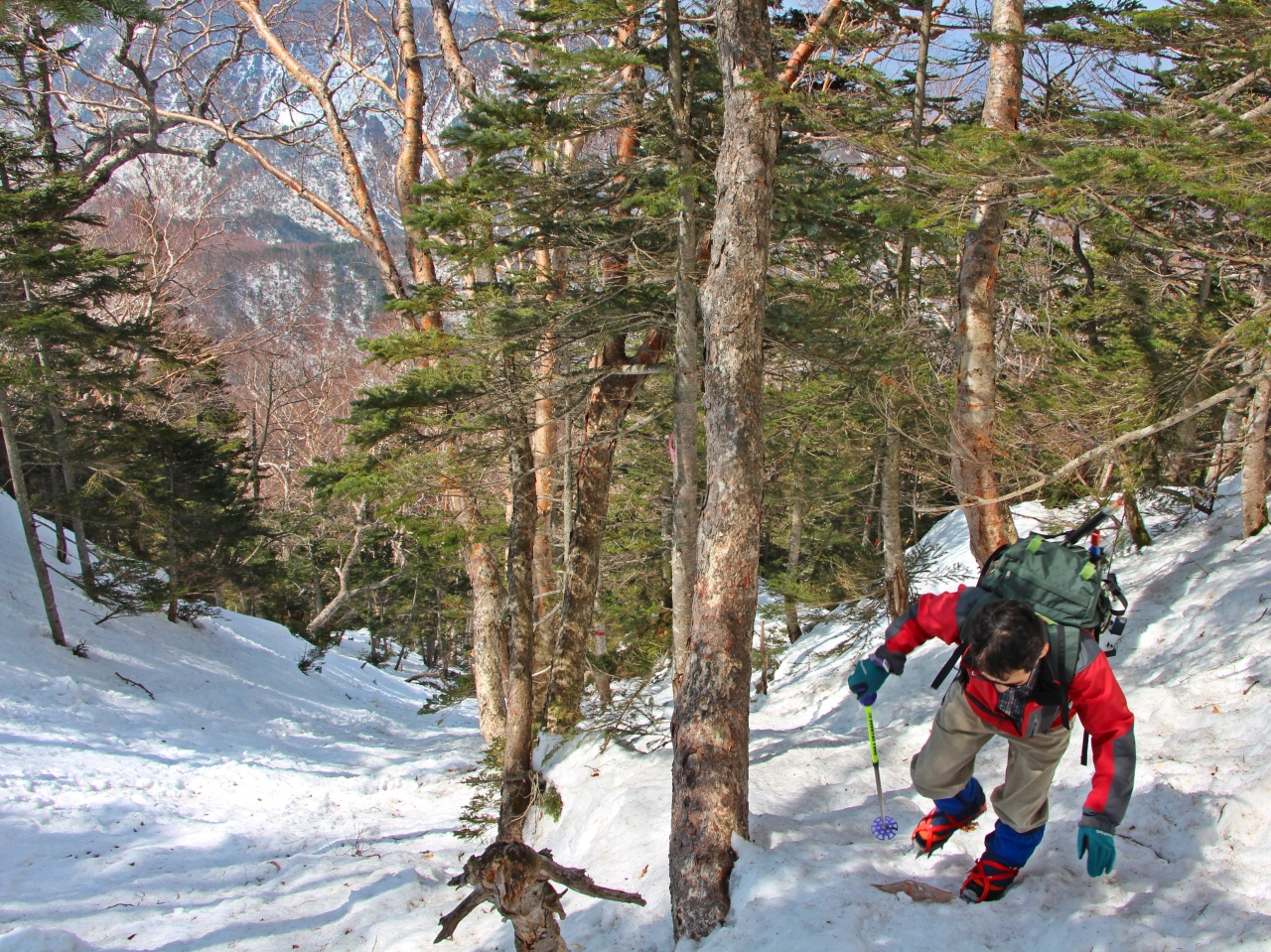 雪が解け、アイスバーンになっている場所も有るのでアイゼンは必須。