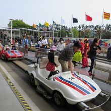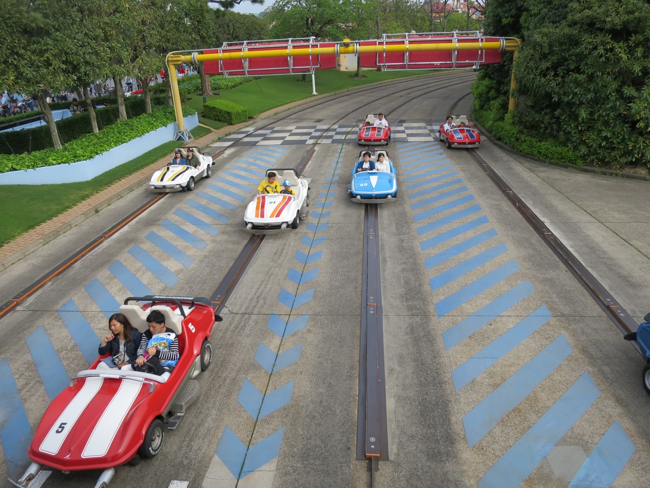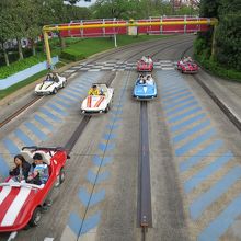トゥモローランドにある二人乗りのゴーカードもどきのアトラクションです。ハンドル、アクセル、ブレーキの操作が出来ますが、レールの上を走っている様なもので、ハンドルを切らなくてもコース通り曲がり、前の車両に近づくと自動的にブレーキが利くので、アクセルを踏むだけのアトラクションと言っても良いと思います。