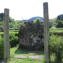 小さな木製の柵で囲われたのが「かぶと石」、裏手の田んぼの中にポツンとあるのが「たいこ石」。これらをまとめて「遊び石」と呼びます。
