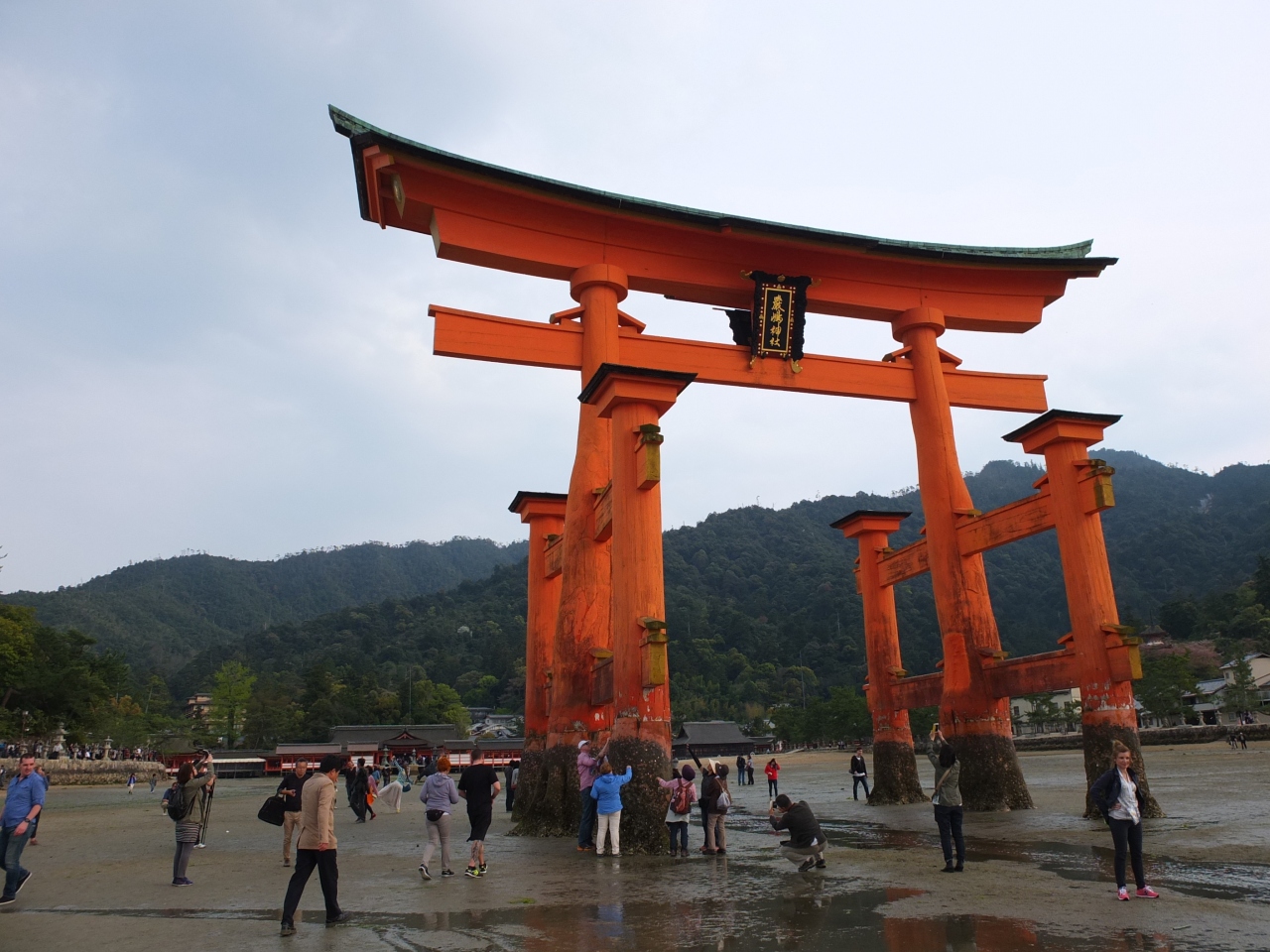 干潮の時には、厳島神社の大鳥居まで歩いていくことができます。潮が引くと、地面もさっと固くなって、ぬかるみに足を取られることなく、普通に歩いていくことができました。間近にいって見上げると、その大きさ、柱の太さに感動しました。