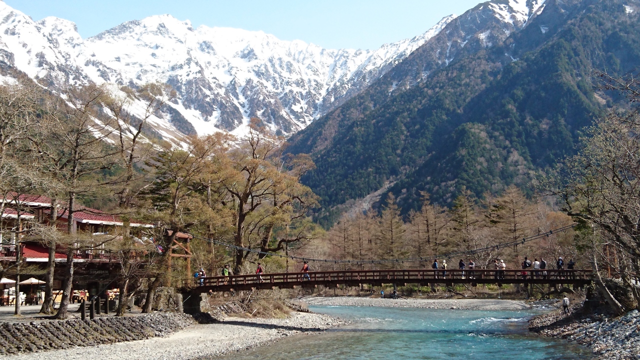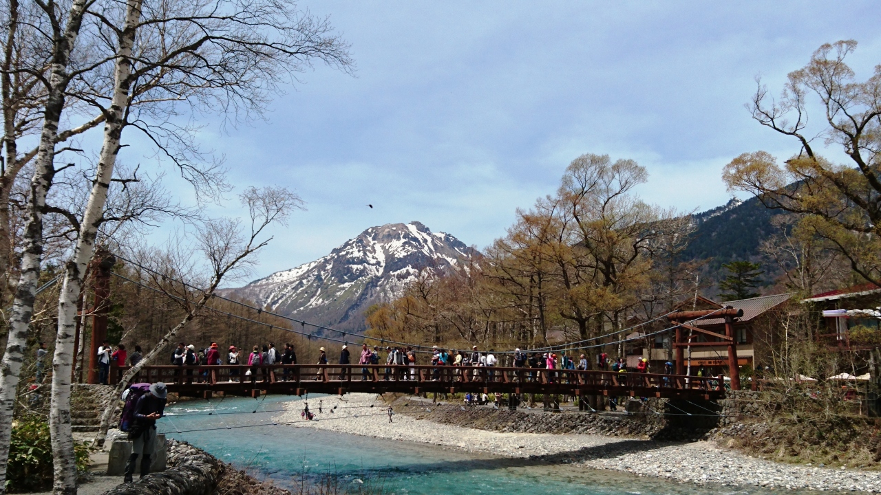 橋から眺める穂高連峰は絶景です。