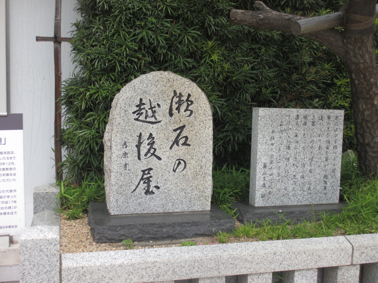 日本橋三越本店の屋上に石碑と次のような碑文がありました。「漱石は小学校へ上がる前に黄八丈や縮面を買いに越後屋へ連れられて来た。夕暮れに雨戸を操る音、店先の暖簾の色は永く記憶に残った。虞美人草浴衣は高級人気品として今なお語り継がれている。