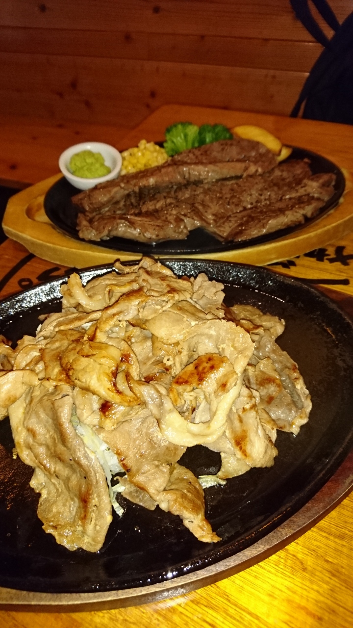 お得な1ポンドステーキとあぐーしょうが焼を注文。