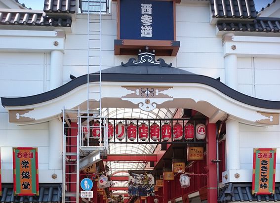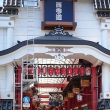 浅草寺の西側にあるアーケードがある商店街です。浅草寺方面の入口が、歌舞伎座風の建物になっています。そして道路は珍しいひのき板の木道です。アーケード内は、柱や窓は鮮やかな朱色で、各店舗の軒先には瓦や提灯、暖簾が飾ってあり、江戸の風情を感じさせる造りです。