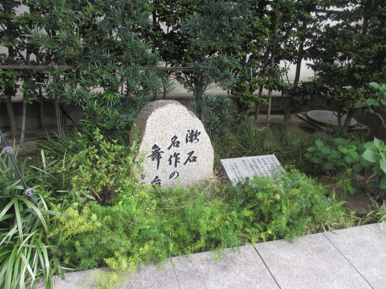 日本橋交差点から日本橋に向かいひとつ目の右折できる道を右折シtsしばらく進むと左手にこちらの碑があります。『三四郎』や『こころ』にこちらの路地の寄席や料理屋が登場するそうです。漱石ファンの方は訪れてみてはいかがでしょうか。