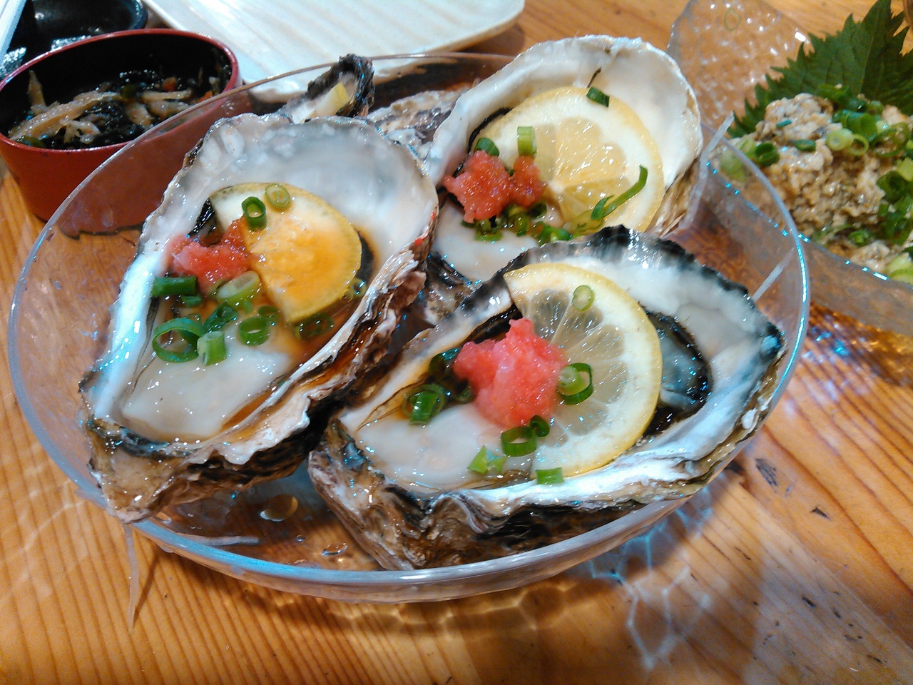 金曜日の夜、予定していた飲食店が満席であったため、空席が目立っていたこの店に飛び込み一席を設けることに。ただ、金曜日とあって30分後の19:00頃にはこちらも満席になりました。全国から珍しい食材を取り寄せているようで、カキなどの貝類やサバやフグなどの鮮魚類が豊富。一方で肉類も負けず劣らずメニューがたくさんありました。