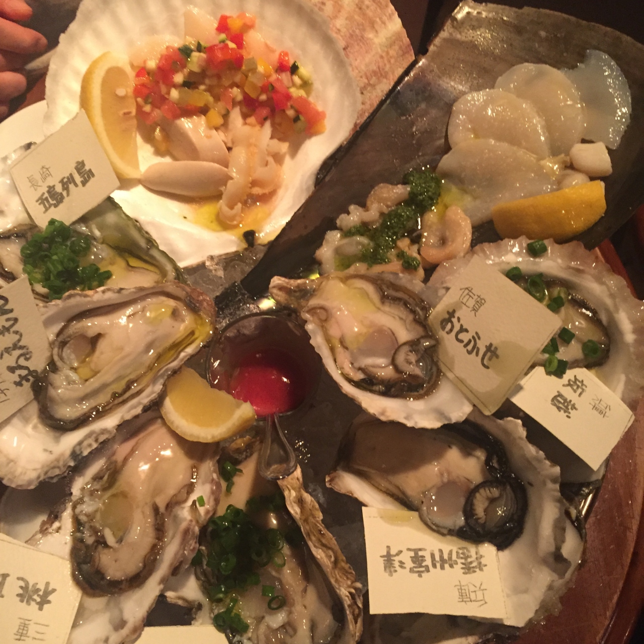 当日のオススメで、産地別に1個ずつ生牡蠣とホタテや平貝などの盛り合わせがありましてそれをオーダー!