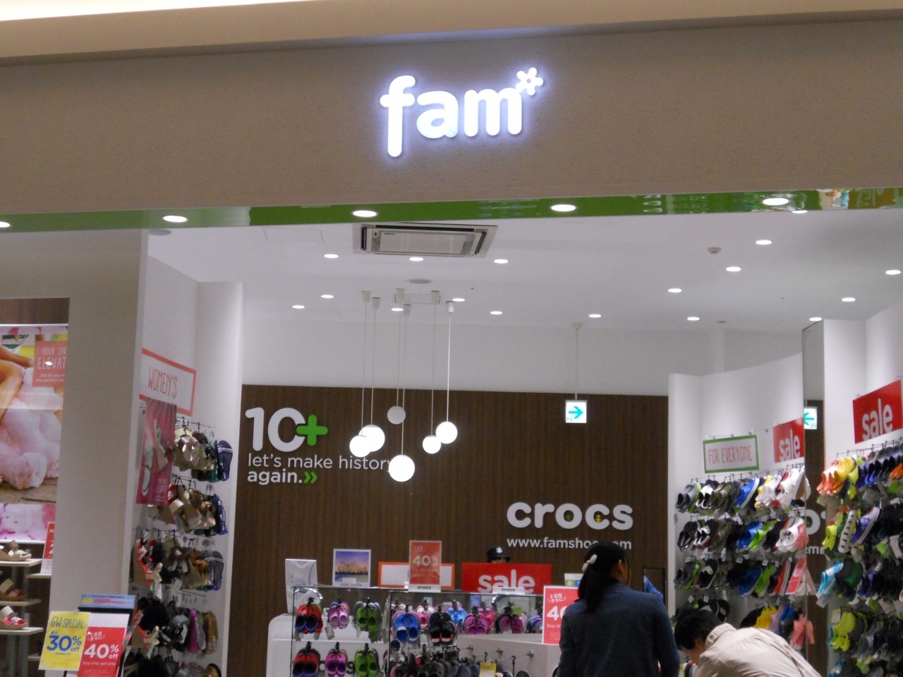 「fam(ファム)」は、琵琶湖のほとり、「近江大橋」からもすぐの「イオンモール草津」の3階、「スリーコインズ」の向かいにある、シューズショップで、クロックスの正規販売代理店です。