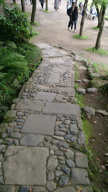 小石川後楽園の南側エリアにある散策路で、内庭にある唐門跡から大泉水、正門方面に続く散策路は木曽路と称して、木曽の風景を再現していますが、そこにあるのがこの延段です。大小の自然石と切り石を組み合わせて、散策路をつくっており、その雰囲気はなとなく中国風な感じもします。斜面につくられていますので、名前の通り段になっています。周辺は木々が鬱蒼としてしているので、非常に趣がある雰囲気です。意識しないと普通に通過してしまいますが、ちょっと足元に注目だと思います。